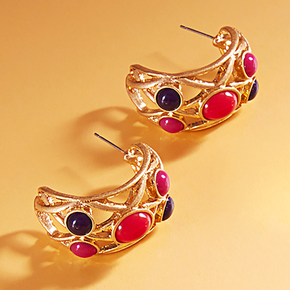 Details • Size : 1.25" X 1.25" X 0.8" • Titanium Post Back • Make a bold statement with these sculpted gold-tone hoop earrings, featuring rich blue, green, and amber stones. Their elegant, artistic design adds vintage charm to any outfit—perfect for dressing up casual looks or complementing evening wear. • Lead and Nickel Compliant • Hypoallergenic