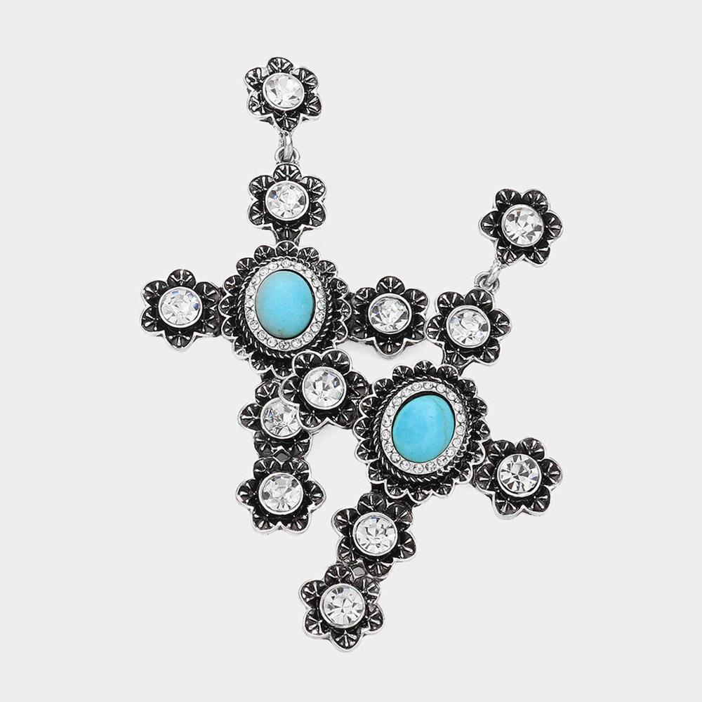 Natural Stone Pointed Stone Embellished Cross Western Dangle Earrings