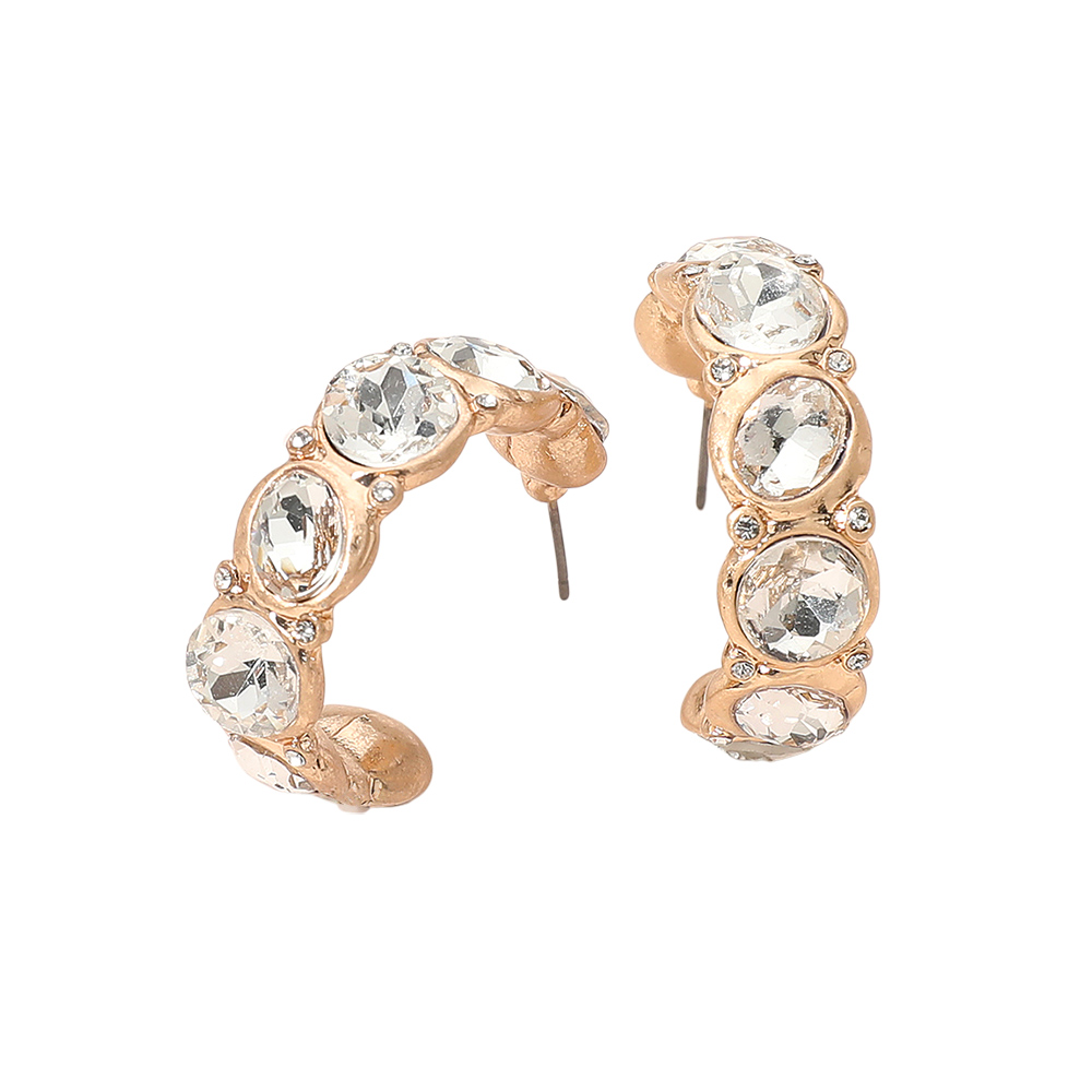 Details • Size : 1.25" X 1.25" X 0.3" • Post Back • Make a glamorous statement with these Oval Round Faceted Stone Embellished Open Hoop Earrings. Designed with multiple faceted stones set in a bold curved frame, these earrings capture the light beautifully, adding effortless sophistication to both day and evening looks. • Lead and Nickel Compliant