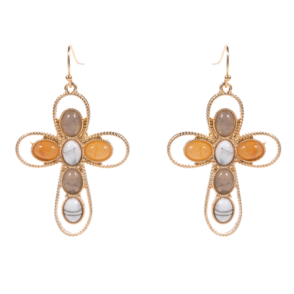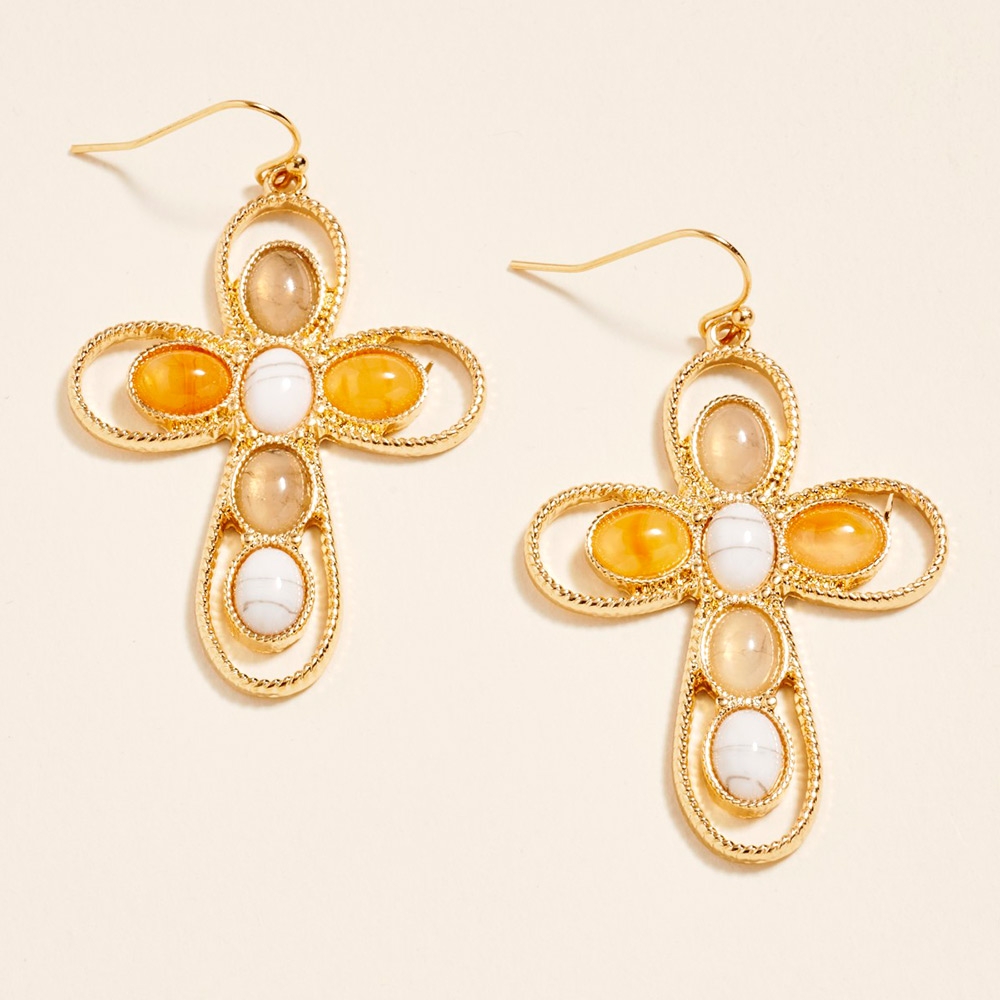 Details • Size : 1.3" X 2.25" • Brass Fish Hook Back • These cross shape drop earrings feature a bold open-frame design accented with smooth oval details for a striking statement look. Designed with graceful movement and eye-catching dimension, they add character to everyday outfits and styled looks alike. Perfect for western-inspired styling, boho collections, or statement jewelry assortments, they offer a unique blend of structure and elegance. • Hypoallergenic • Lead and Nickel Compliant