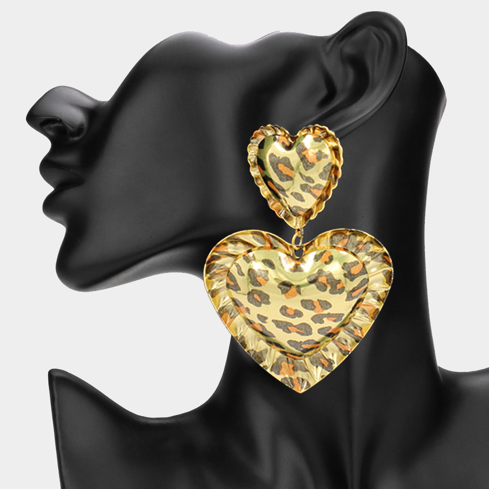 Oversized Leopard Pattern Printed Double Heart Dangle Earrings