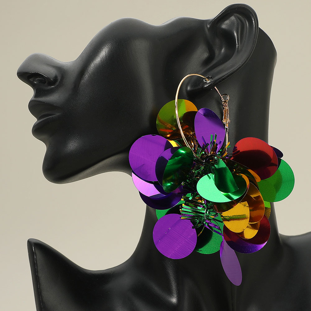 Details • Size : 3.5" X 4.5" • Omega Back • Bring the party wherever you go with these bold Mardi Gras tinsel sequin hoop earrings. Featuring oversized hoops adorned with shimmering sequins, they radiate festive energy and dynamic movement. Perfect for parades, celebrations, and statement looks that capture true carnival spirit. • Lead and Nickel Compliant