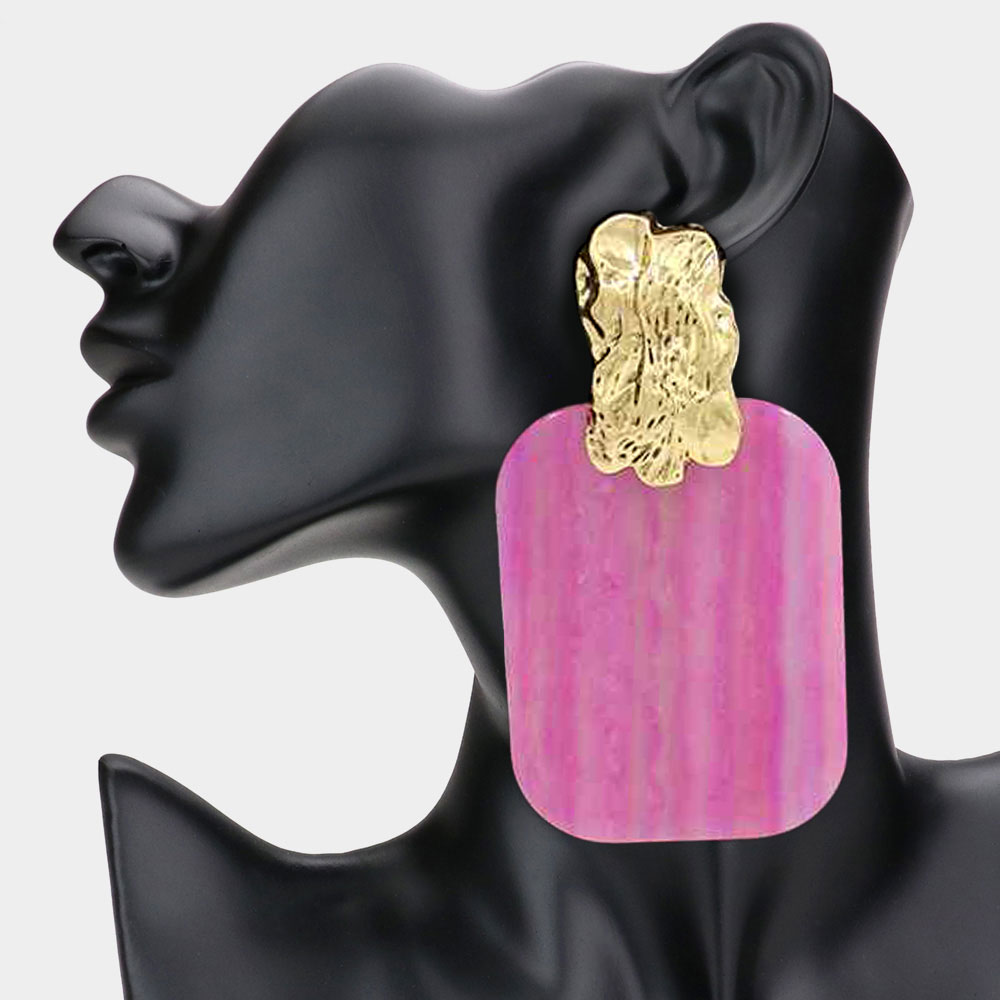 Details • Size : 2.2" X 4.2" • Post Back • Elevate your style with these bold statement drop earrings featuring a marbled rectangular pendant and textured top accent. Perfect for pairing with casual or dressy outfits, these earrings add a modern, artistic edge, making them an eye-catching accessory for any fashion-forward look. • Lead and Nickel Compliant