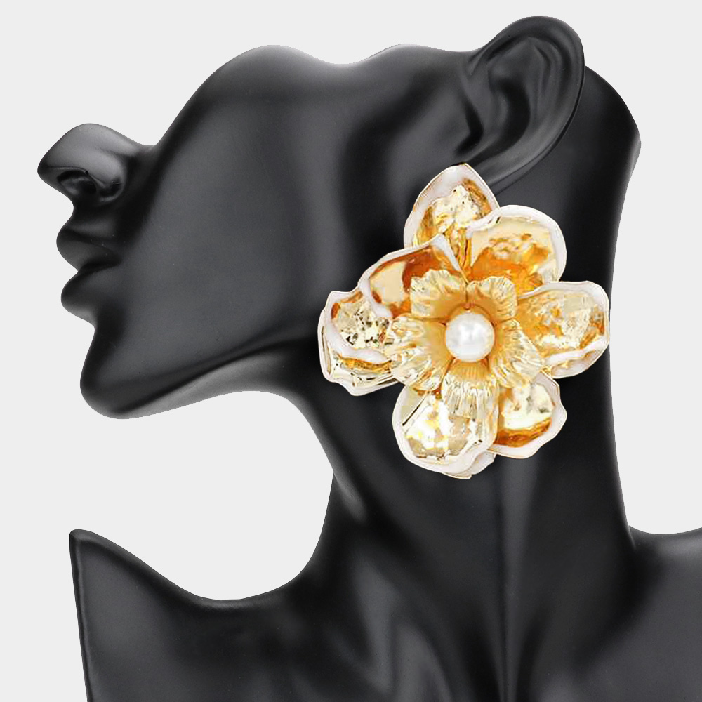 Oversized Pearl Pointed Enamel Painted Rim Hammered Metal Flower Earrings