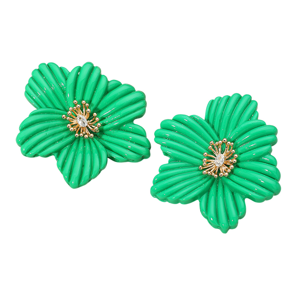 Details • Size : 2.5" X 2.5" • Post Back • Discover these statement floral earrings featuring a bold sculpted flower with a sparkling crystal center. Lightweight and stylish, they add a refined, timeless touch to any outfit, perfect for both everyday elegance and special occasions. • Lead and Nickel Compliant