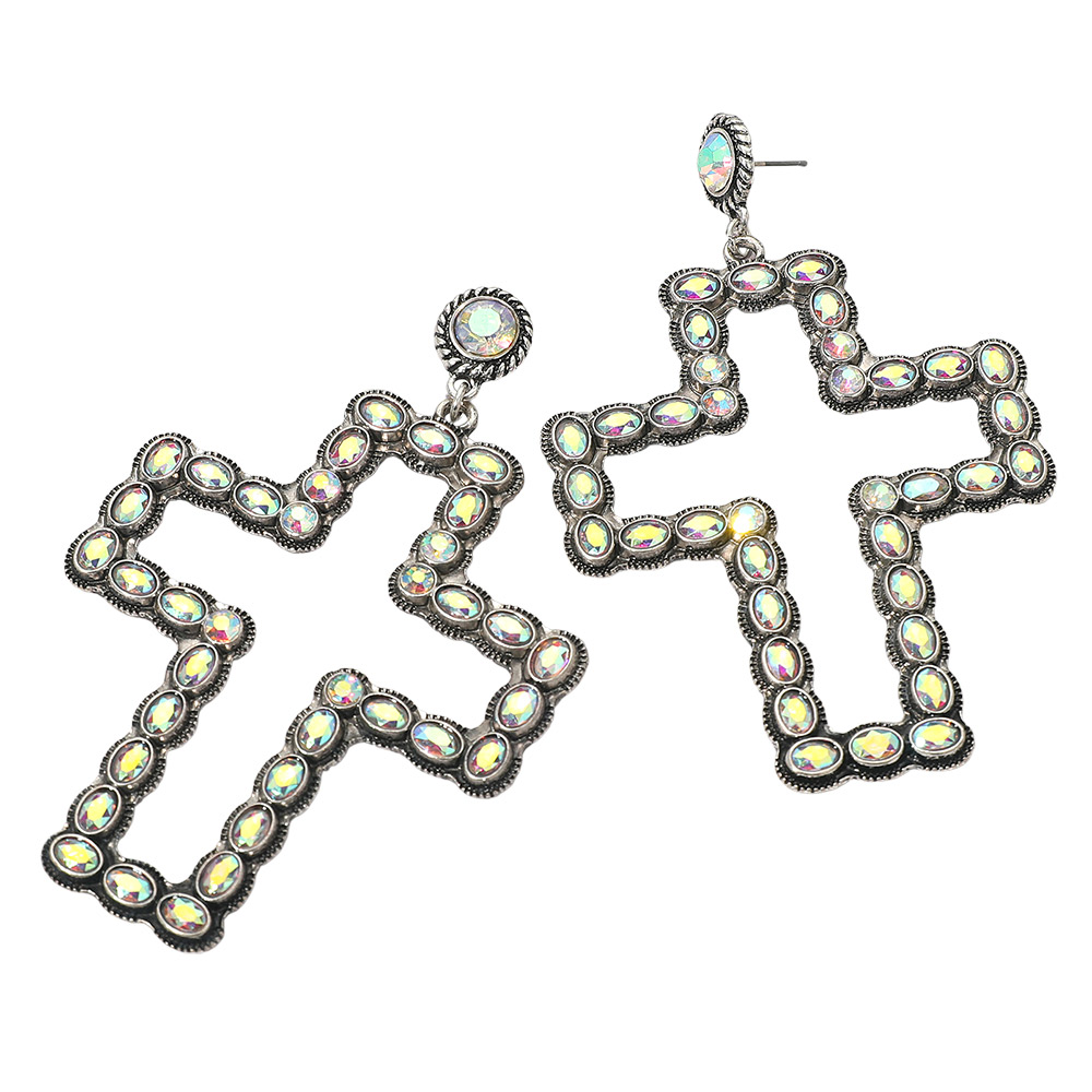 Details • Size : 2.6" X 4.1" • Post Back • Bold oversized cross earrings designed with shimmering accent details, perfect for making a dramatic style statement. Ideal for standout looks, these earrings add a striking touch to festival outfits, night-out ensembles, or edgy fashion styling. • Lead and Nickel Compliant