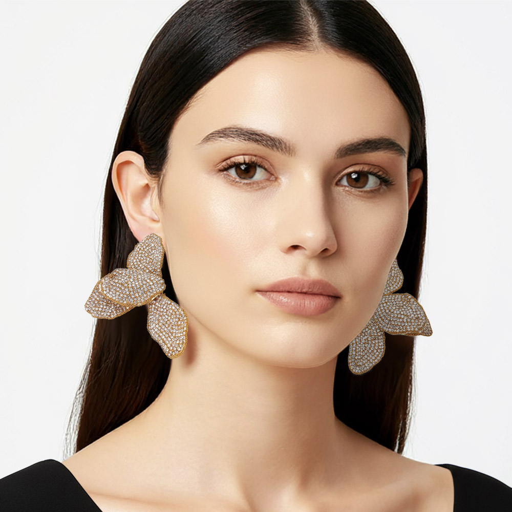 Details • Size : 2.3" X 3.4" • Post Back • Turn heads with these oversized floral petal statement earrings, designed to add a touch of whimsy and elegance to your outfit. The textured detailing and sculptural silhouette make them a standout accessory, perfect for elevating any look with modern, fashion-forward charm. • Lead and Nickel Compliant