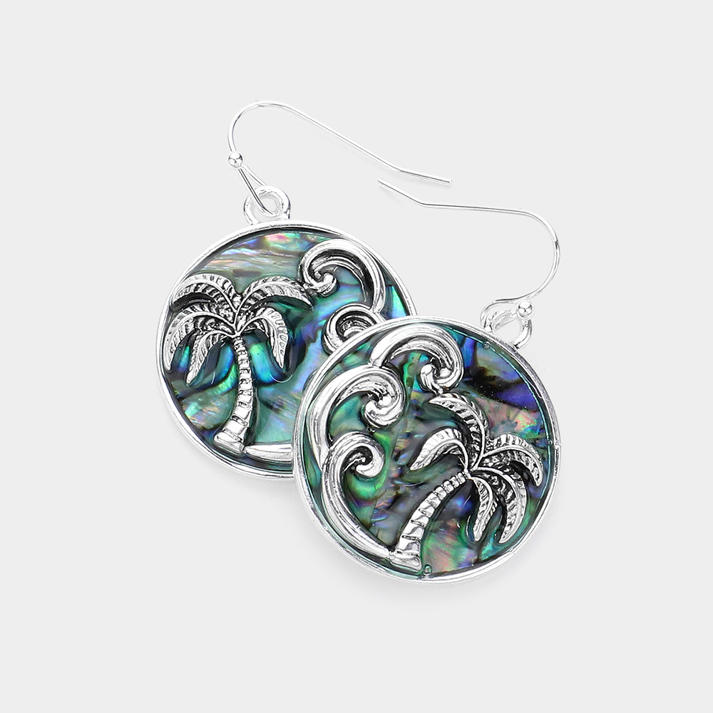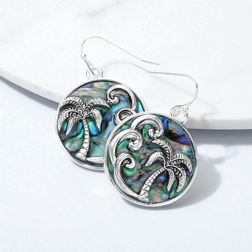 Details • Size : 1" X 1.5" • Fish Hook Back • Round dangle earrings featuring a tropical palm tree and ocean wave design, bringing a beach-inspired vibe. Perfect accessory for summer outfits, vacations, or adding a coastal charm to everyday style. • Lead and Nickel Compliant