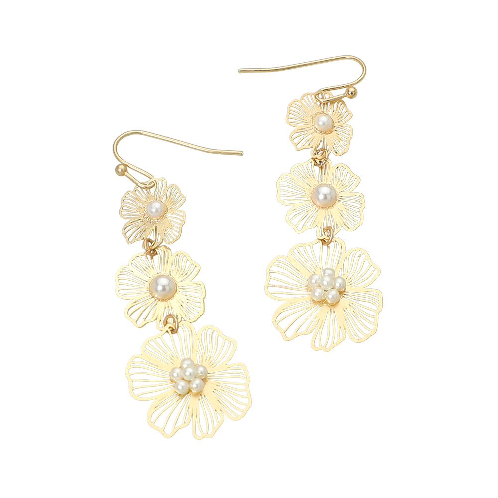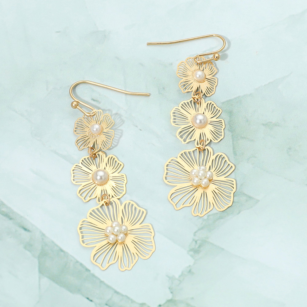 Details • Size : 0.75" X 2.25" • Fish Hook Back • Elegant drop earrings featuring layered floral designs accented with delicate pearl centers for graceful movement and visual depth. This feminine style adds a refined statement to everyday outfits, weddings, parties, and special occasions. A timeless floral silhouette that appeals to customers seeking romantic, lightweight, and eye-catching accessories with classic charm. • Lead and Nickel Compliant