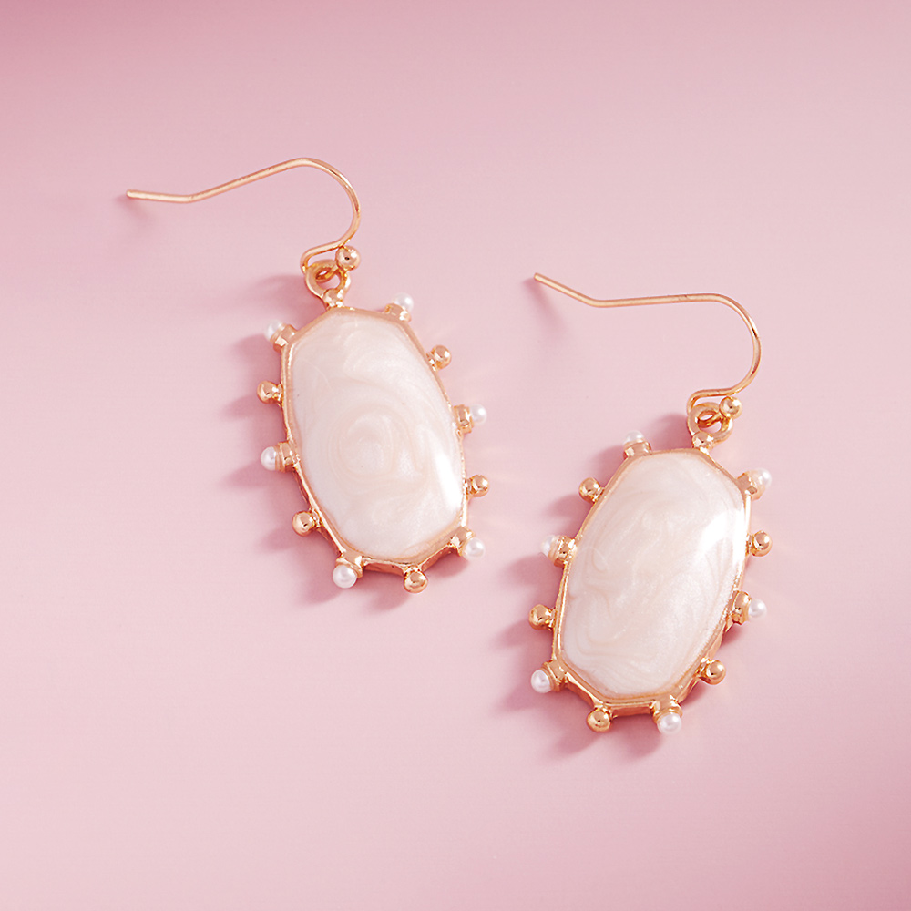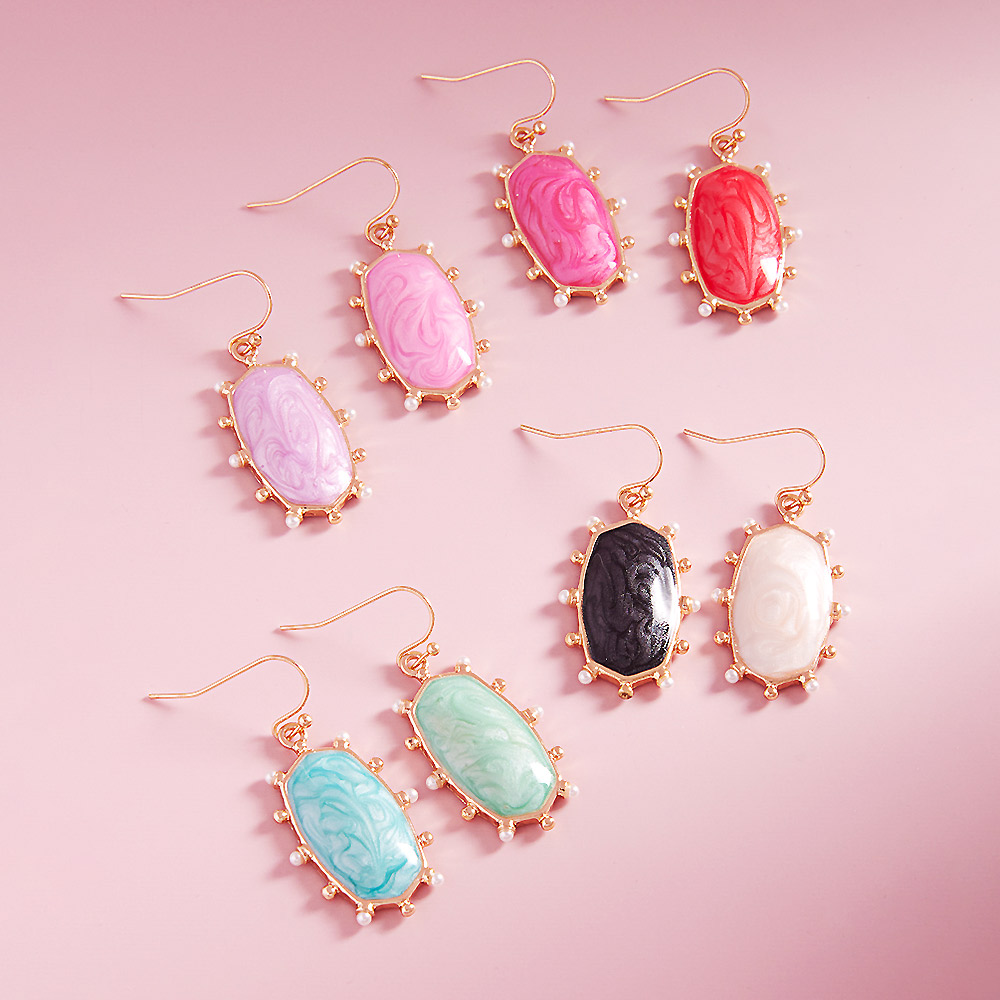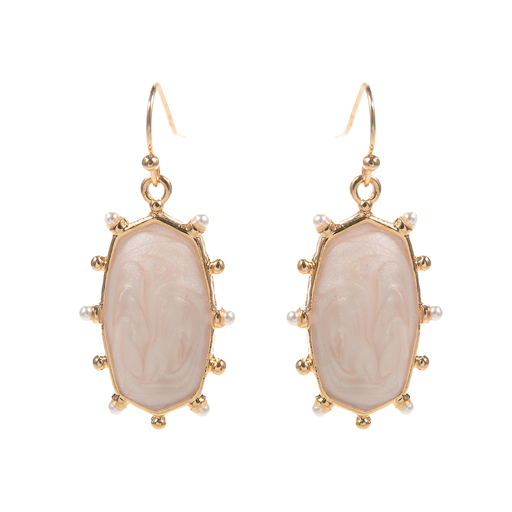 Pearl Around Marbled Enamel Hexagon Plate Dangle Earrings