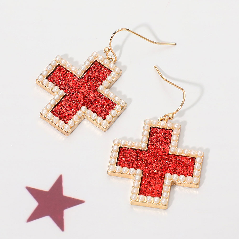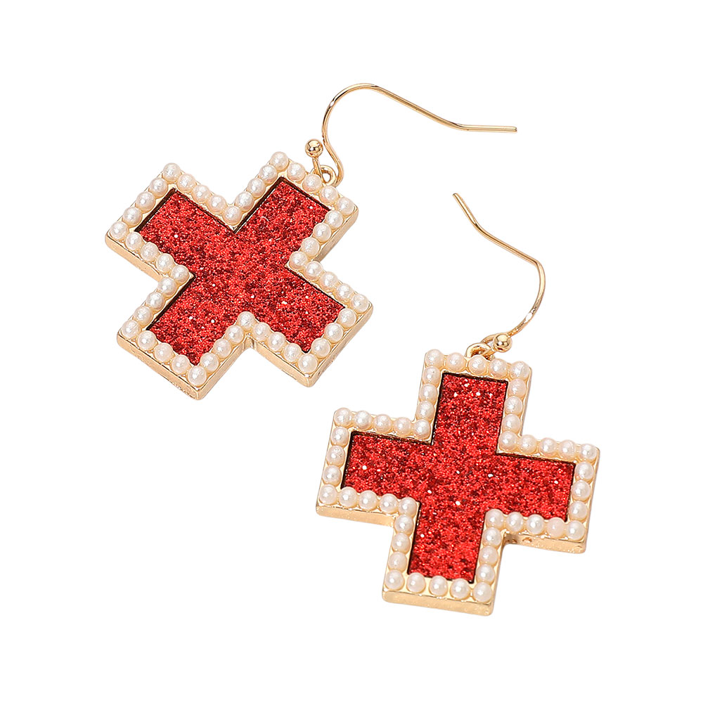 Pearl Edge Sparkle Cross Dangle Earrings Pearl Edge Sparkle Cross Dangle Earrings