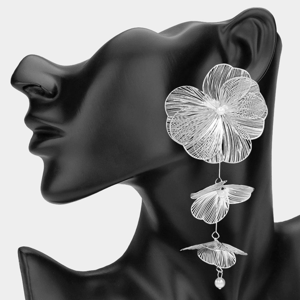 Pearl Tip Metal Filigree Flower Petal Drop Earrings