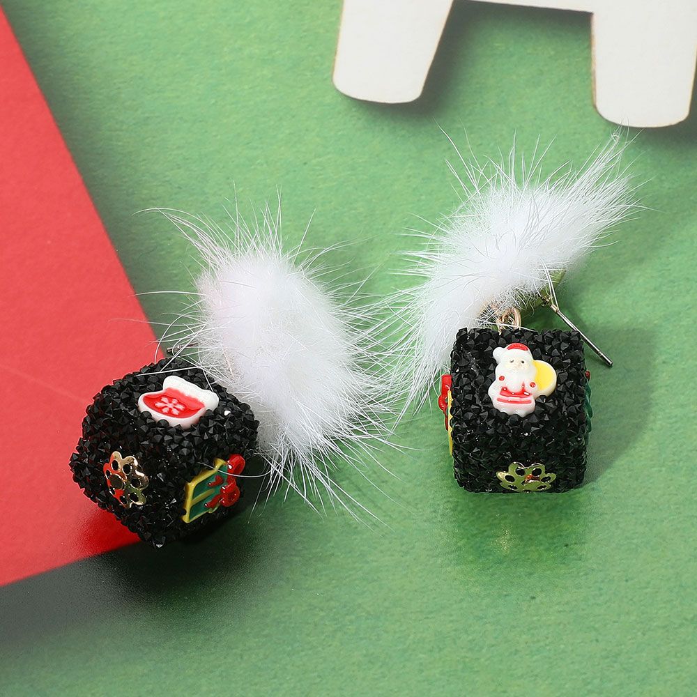 • Add festive fun to your look with these Christmas dice earrings featuring glittery cube charms, holiday icons, and a fluffy top—perfect for seasonal cheer.