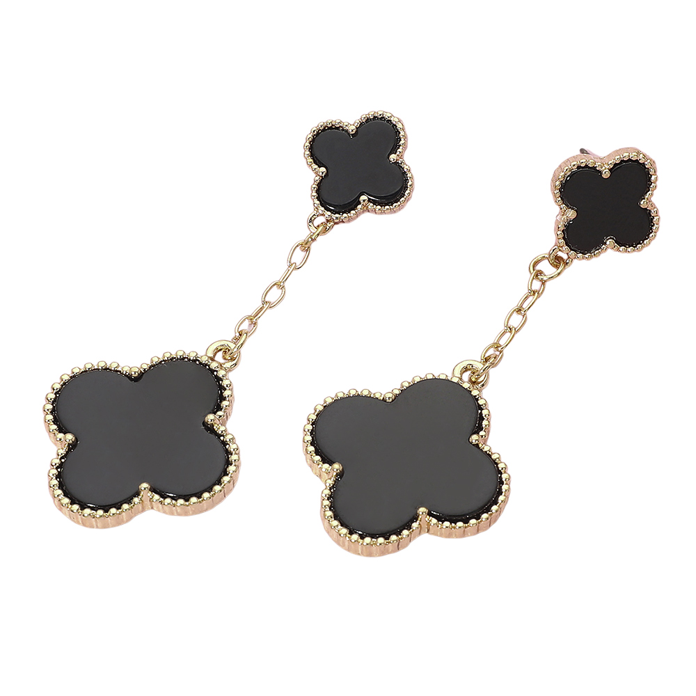 Details • Size : 1" X 2.6" • Post Back • Stylish chain drop earrings featuring layered quatrefoil charms for a soft, elegant look with gentle movement. This timeless silhouette adds refined detail to everyday outfits and special occasion styling, making it a versatile choice for boutiques, gift assortments, and curated jewelry collections seeking modern yet classic appeal. • Lead and Nickel Compliant