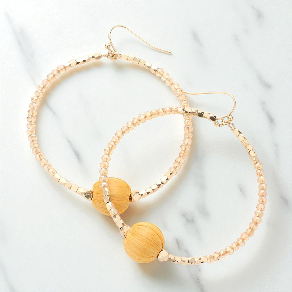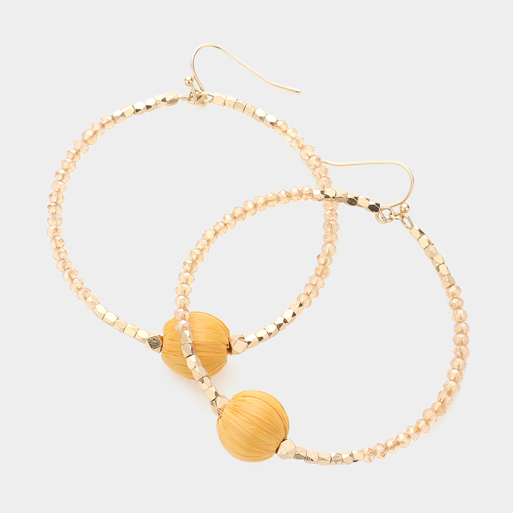 Raffia Ball Accented Faceted Beaded Open Circle Dangle Earrings