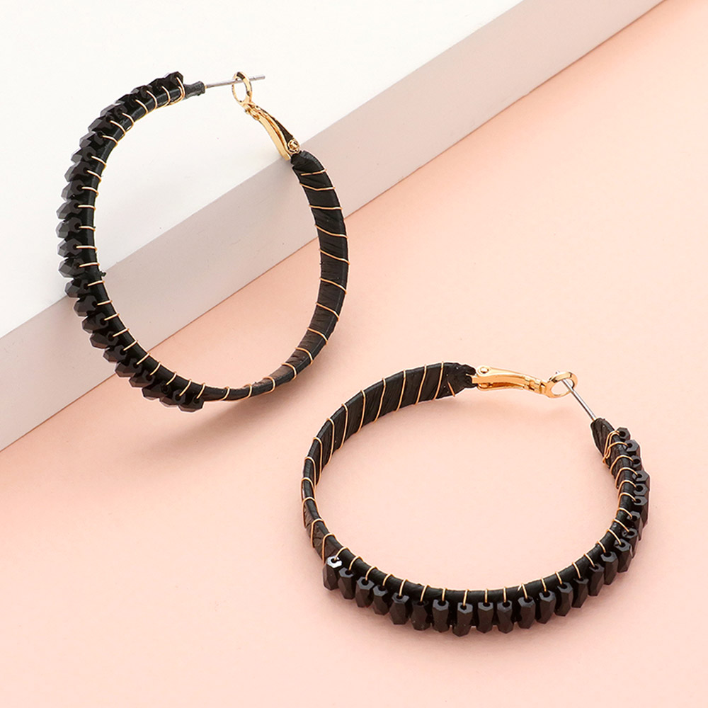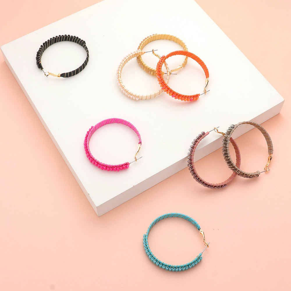 Rectangle Bead Trimmed Raffia Wrapped Hoop Earrings