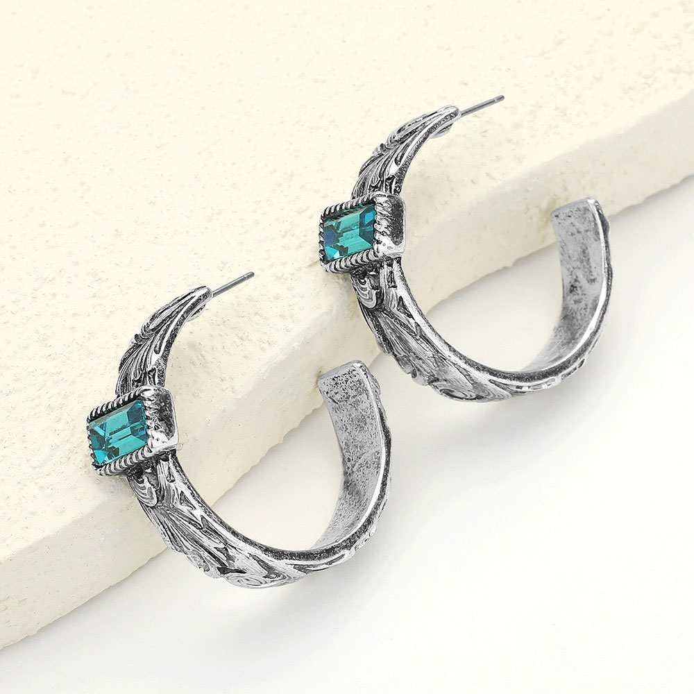 Rectangle Stone Pointed Antique Metal Western Hoop Earrings