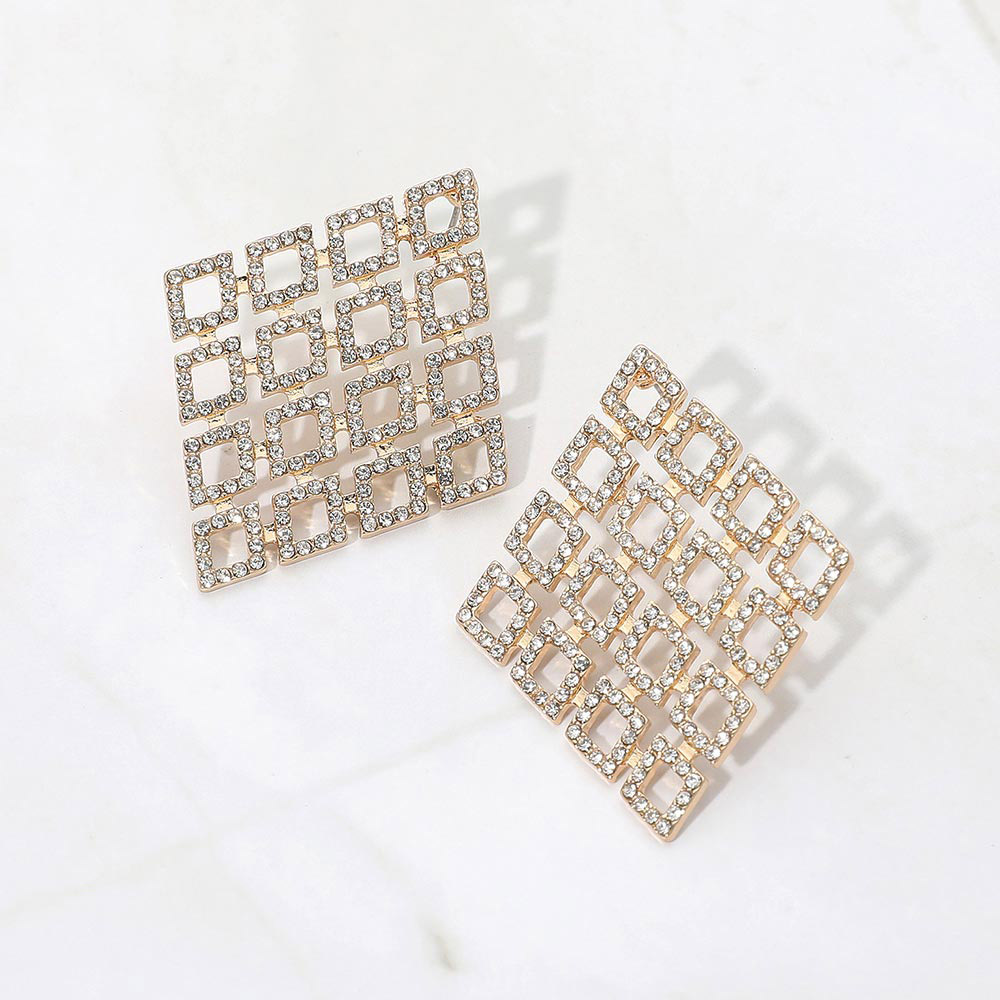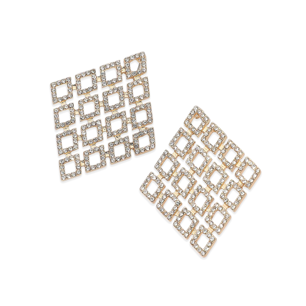 • Bold geometric stud earrings featuring an open square grid design accented with shimmering pavĂ© detail. The structured silhouette delivers modern elegance with statement appeal, making these earrings ideal for evening wear, special occasions, and fashion-forward accessory assortments.