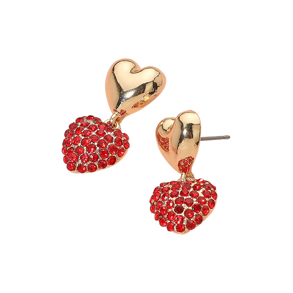 Details • Size : 0.5" X 1.2" • Post Back • Add a touch of romance with these sparkling double heart earrings, featuring a sleek metallic top heart and a dazzling crystal-accented lower heart. Perfect for day-to-night wear, they bring elegant charm and a playful shimmer to your style effortlessly. • Lead and Nickel Compliant