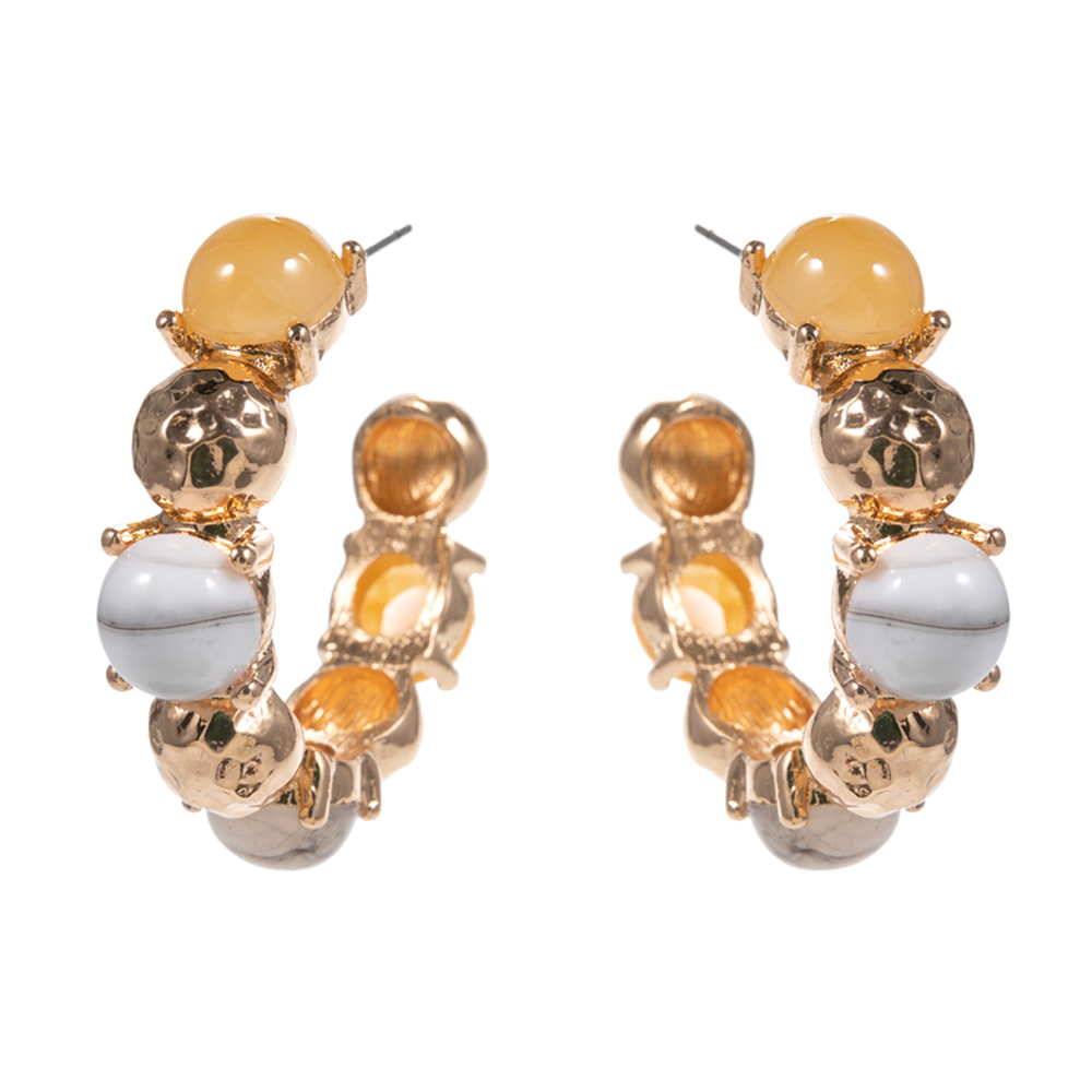 Details • Size : 1.7" X 1.7" X 0.4" • Titanium Post Back • These beaded hoop earrings feature a bold curved silhouette accented with mixed shape bead details for a playful yet elevated statement. Designed with dimensional texture and eye-catching form, they add personality to everyday outfits and styled looks. A versatile accessory ideal for boho-inspired collections, fashion-forward assortments, or gifting, offering a unique balance of structure and charm. • Hypoallergenic • Lead and Nickel Compliant