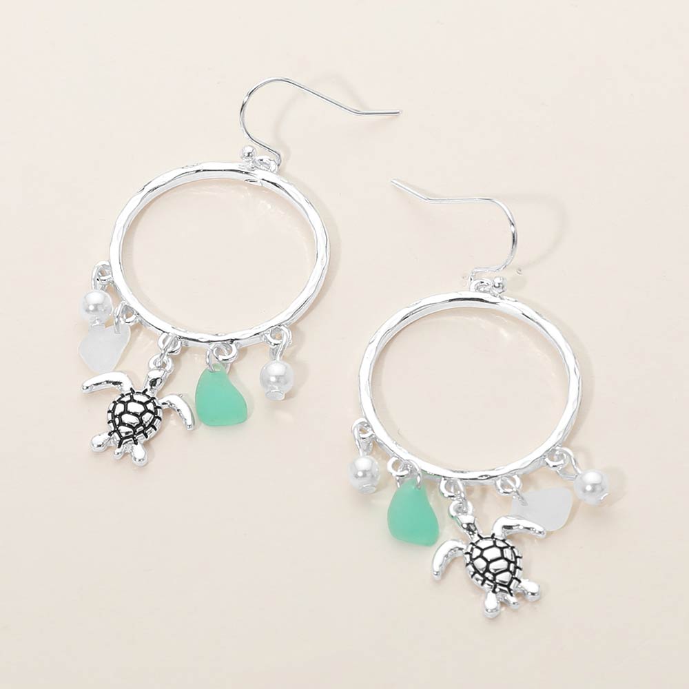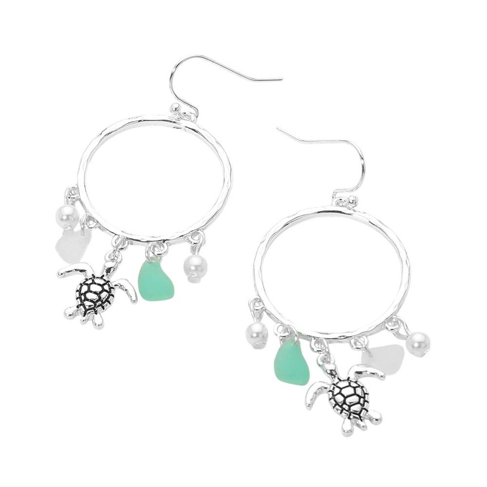Sea Turtle Sea Glass Charm Drop Open Ring Dangle Earrings