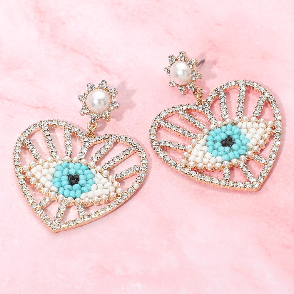 Seed Beaded Evil Eye Accent Rhinestone Pave Heart Drop Earrings