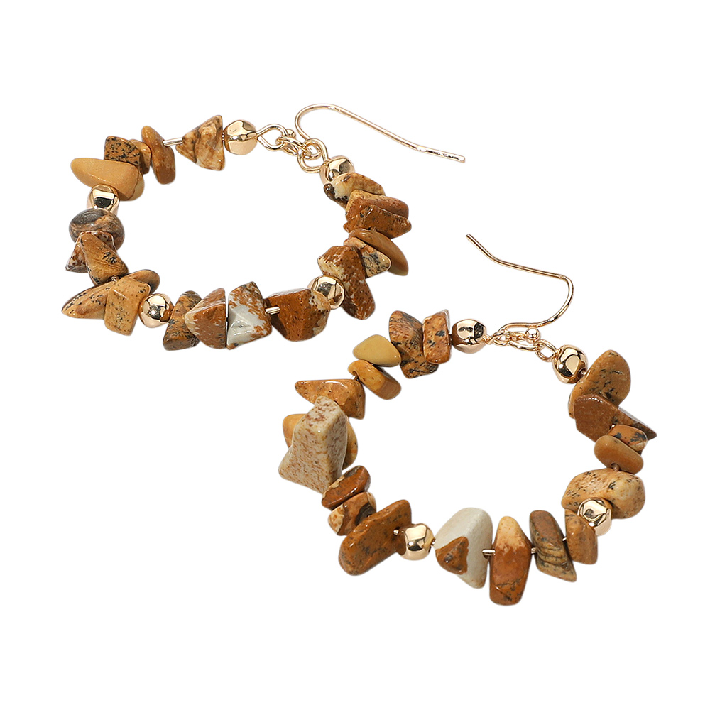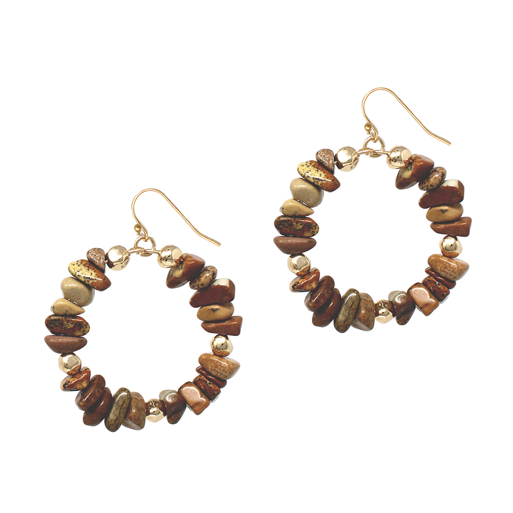 Details • Size : 2" X 2.25" • Fish Hook Back • Bold hoop earrings adorned with polished stone beads and metallic accents. Perfect for adding a touch of natural elegance to everyday wear or making a statement at special events and gatherings. • Lead and Nickel Compliant