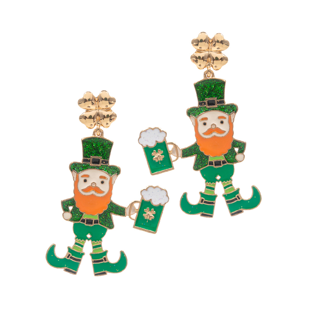 Details • Size : 1.25" X 2.4" • Post Back • Festive drop earrings showcasing a cheerful leprechaun figure paired with a raised mug charm for playful movement and standout appeal. Designed to add lively personality to party looks, themed outfits, and holiday celebrations while remaining easy to style and gift. • Lead and Nickel Compliant
