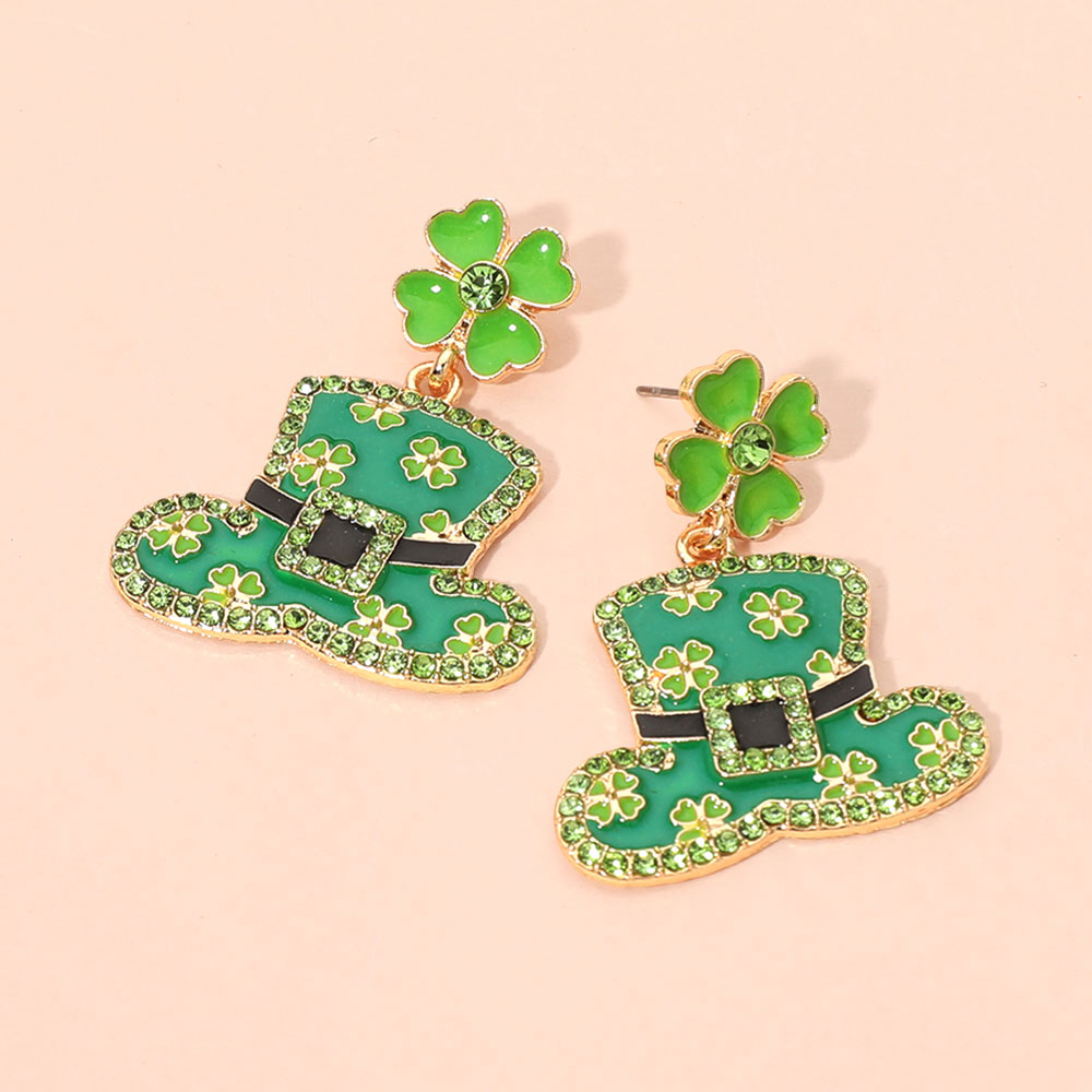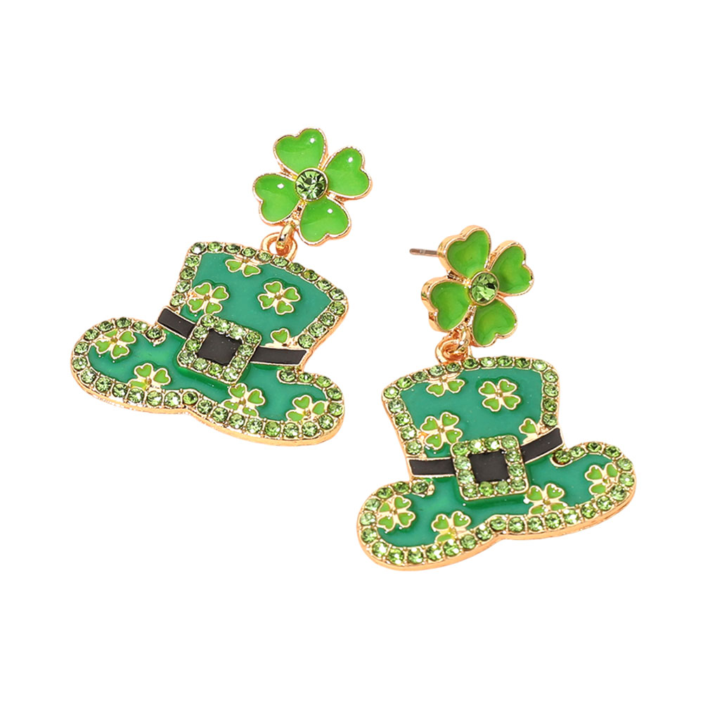 • Festive clover hat drop earrings designed to bring playful charm and seasonal appeal to any accessory collection. Featuring detailed accents and a fun dangling silhouette, these statement earrings are perfect for holiday events, themed outfits, and eye-catching boutique displays that celebrate luck and cheerful style.
