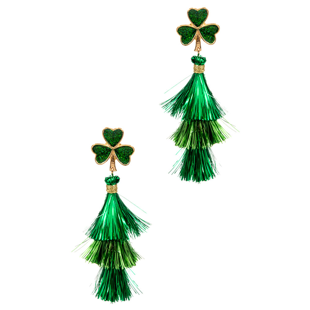 Details • Size : 0.75" X 2.8" • Titanium Post Back • Festive drop earrings featuring a shamrock accent paired with layered tassel movement for bold visual impact. Designed to stand out in holiday, game day, party, and seasonal displays, this playful style adds motion and personality while remaining lightweight and easy to wear for all-day celebrations. • Lead and Nickel Compliant • Hypoallergenic