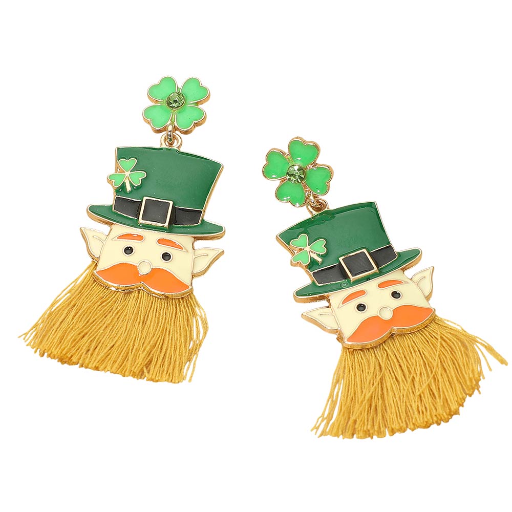 Details • Size : 1.1" X 2.5" • Post Back • Festive leprechaun clover tassel drop earrings designed to stand out with playful character details and eye-catching movement. A fun statement accessory for seasonal celebrations, themed outfits, party styling, and gift selections, offering lightweight comfort with bold personality for all-day wear. • Lead and Nickel Compliant