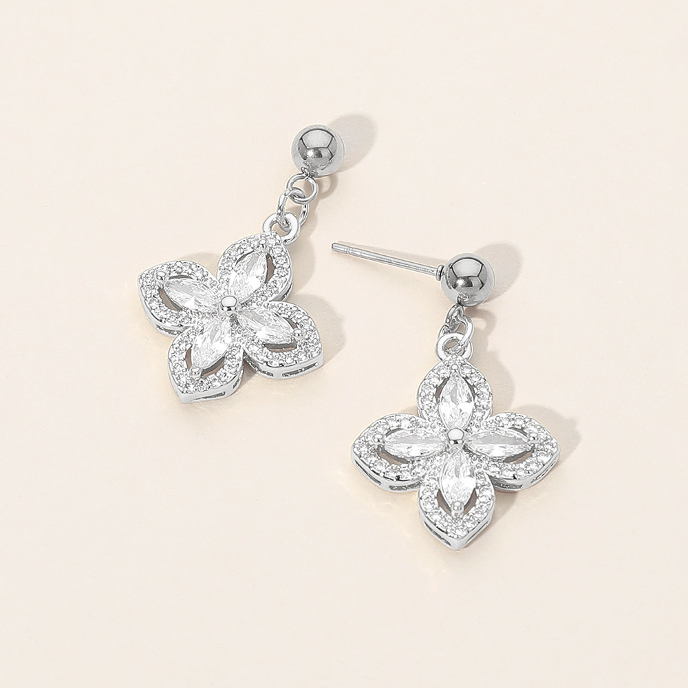 Details • Size : 0.75" X 1.25" • Post Back • Elegant floral cz drop earrings featuring a layered petal design with shimmering accents that add graceful movement and refined shine. Designed to elevate everyday outfits and special occasion looks, these earrings are a versatile choice for boutiques, gifting, and customers seeking timeless, feminine jewelry. • CZ Cubic Zirconia • Stainless Steel