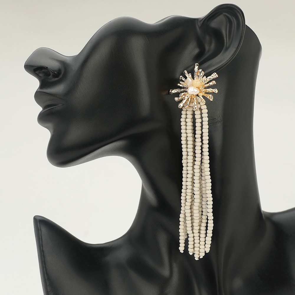 Details • Size : 1.25" X 4.8" • Post Back • Elegant long beaded tassel earrings featuring a radiant sunburst stud design with cascading strands for a striking look. Perfect for parties, evening wear, or elevating your everyday style, these earrings add sophistication, charm, and graceful movement to any outfit. • Lead and Nickel Compliant