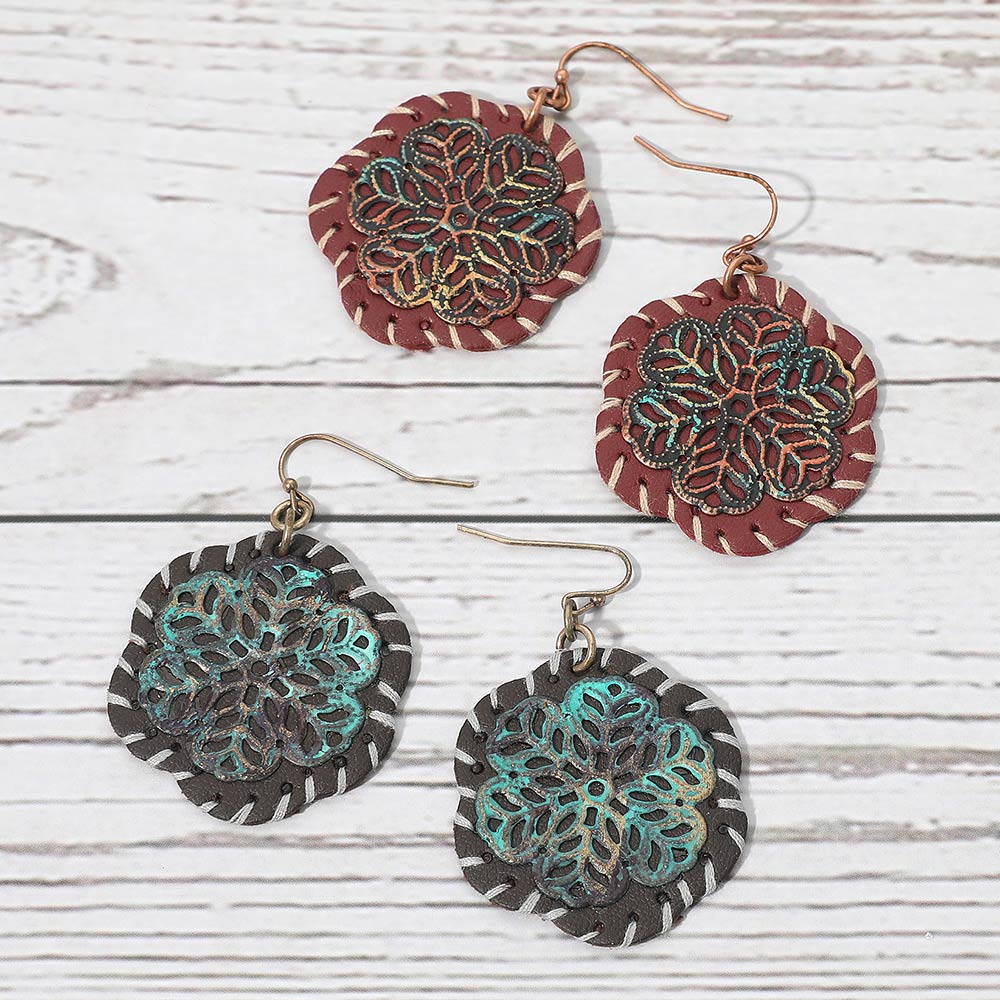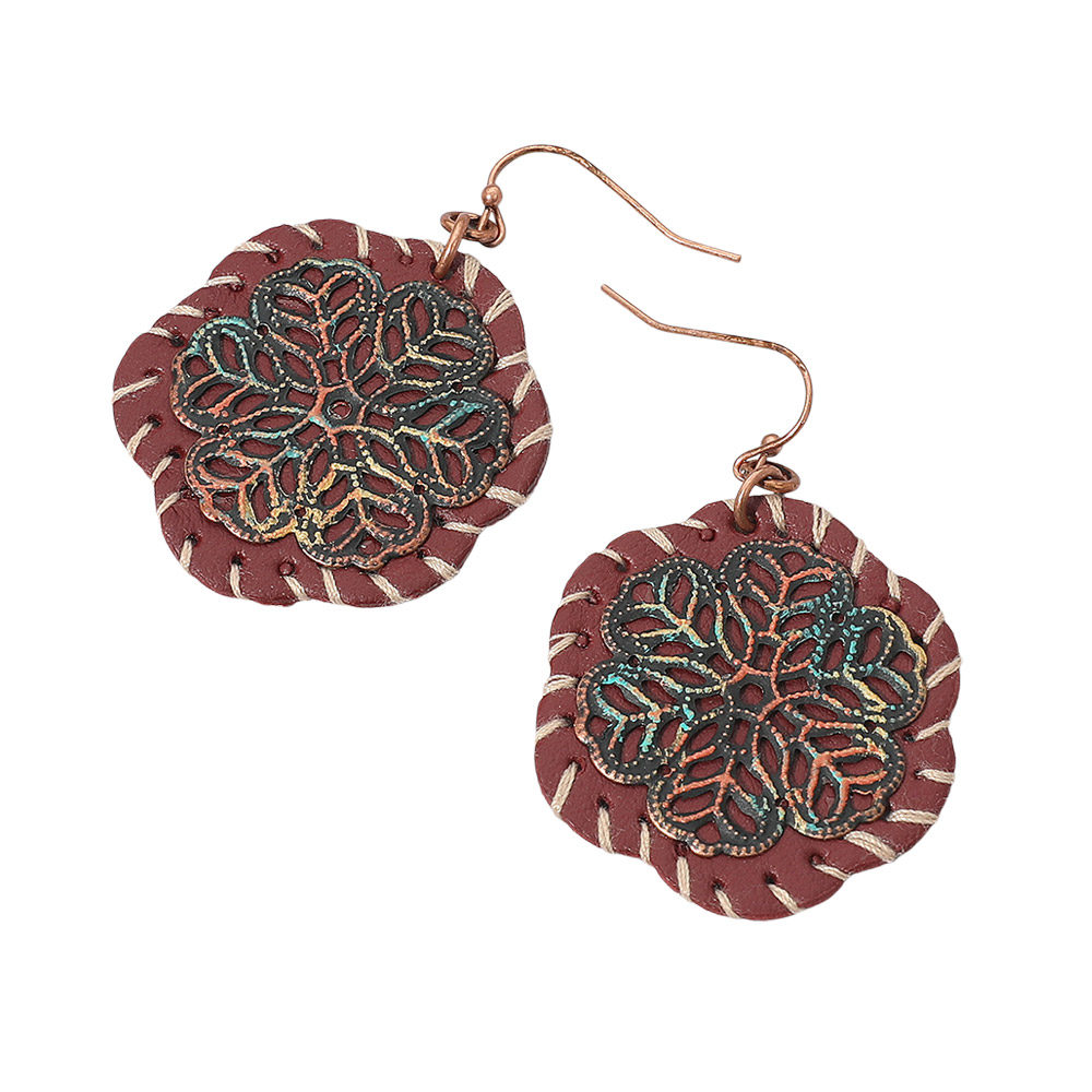 Stitched Faux Leather Layered Metal Floral Dangle Earrings