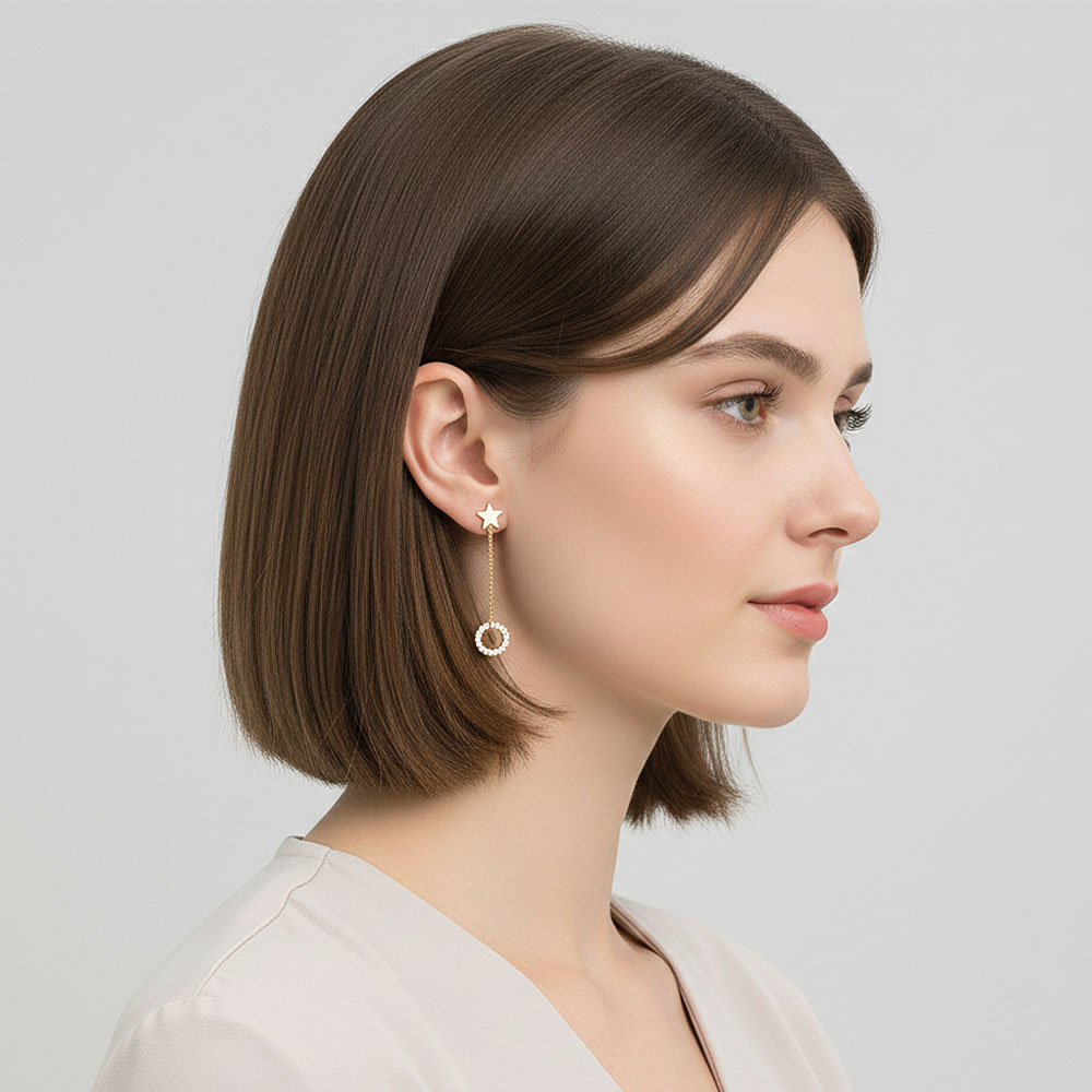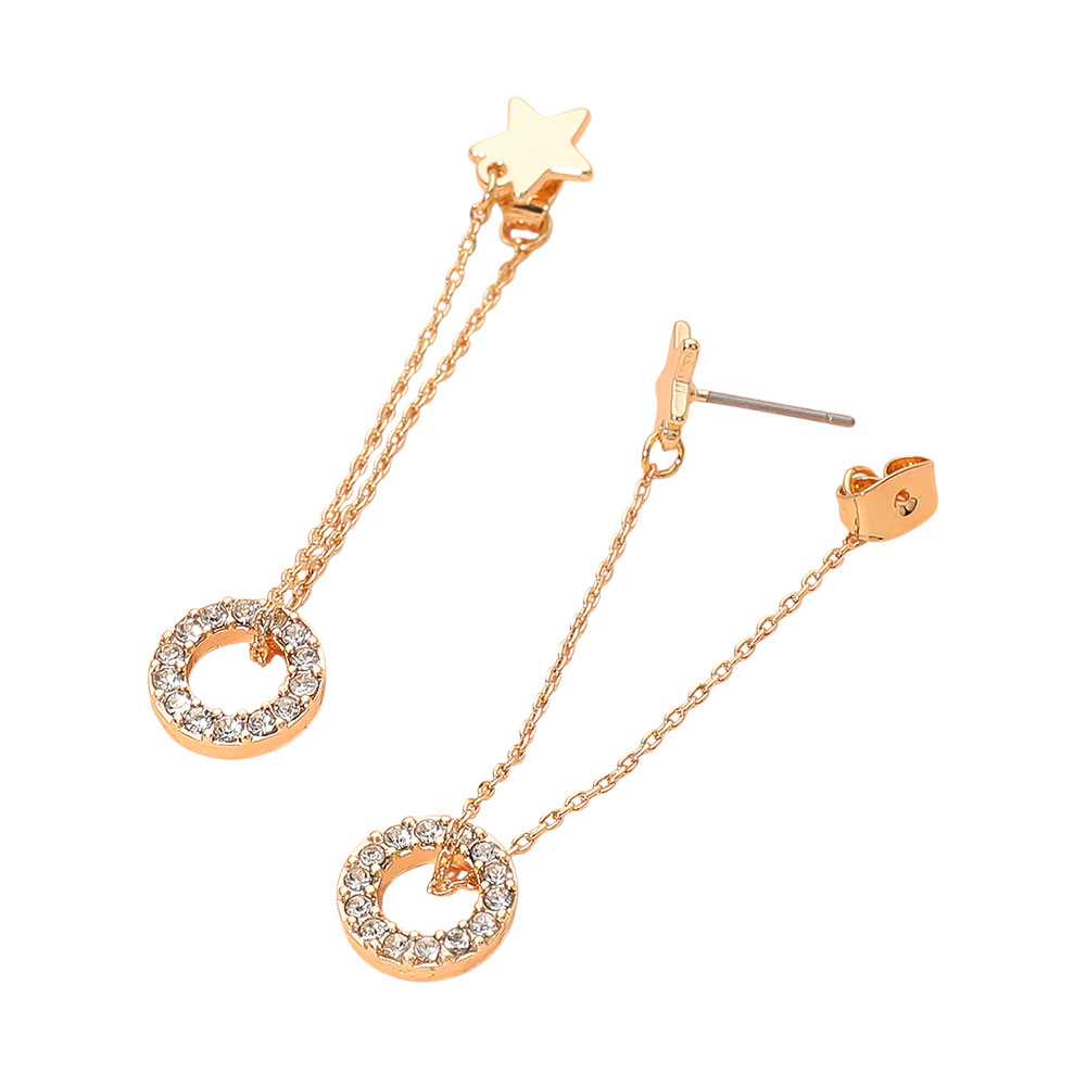 Details • Size : 0.4" X 2.1" • Post Back • Dainty chain drop earrings featuring a star stud paired with a sparkling open halo charm for graceful movement and subtle shine. Designed to elevate everyday looks or complement evening wear with an effortlessly elegant, lightweight statement that adds modern charm. • Lead and Nickel Compliant