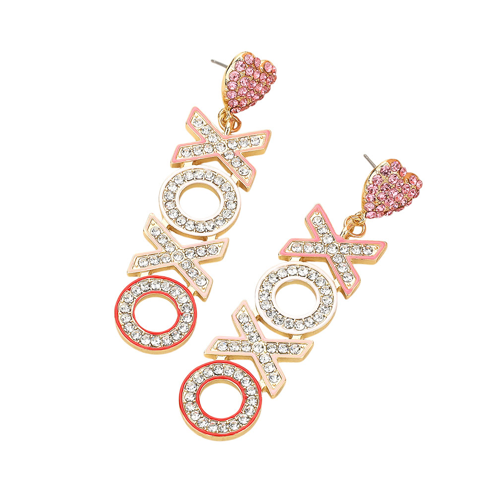 Stone Paved XOXO Message Dangle Heart Pointed Earrings