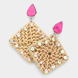 Teardrop Natural Stone Studded Woven Wood Square Link Dangle Earrings