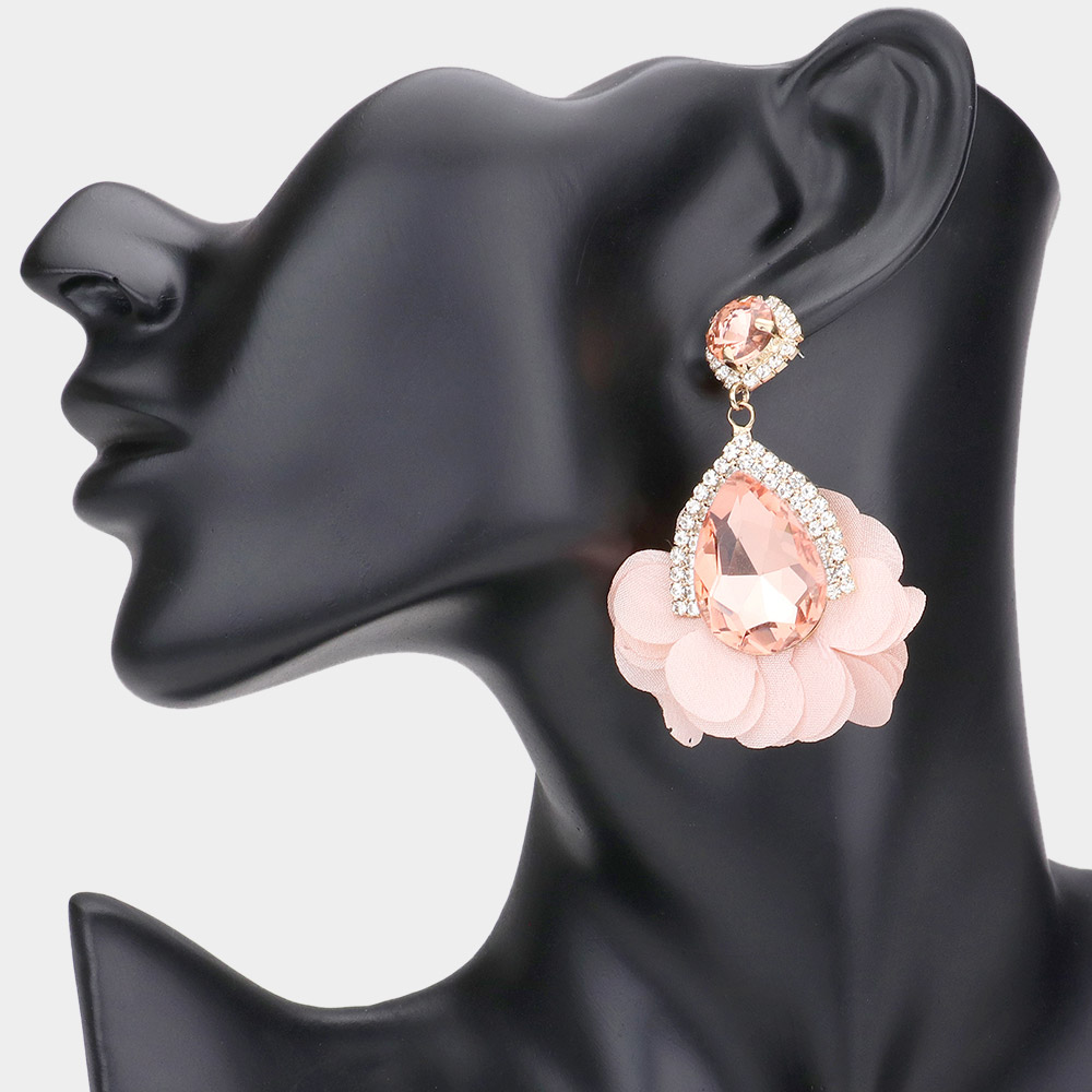 Teardrop Stone Accented Fabric Petal Cluster Dangle Earrings