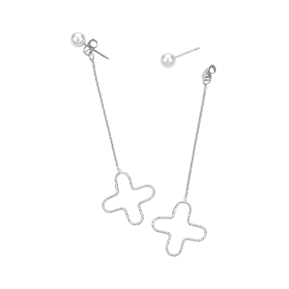 Details • Size : 0.75" X 2.9" • Post Back • Elegant dangling chain earrings featuring delicate clover outline drops and pearl stud tops. Lightweight and stylish, these earrings bring a chic and modern touch to both casual and dressy outfits. • Lead and Nickel Compliant • Brass