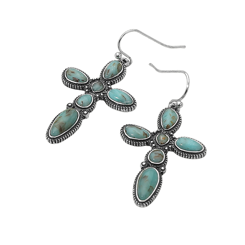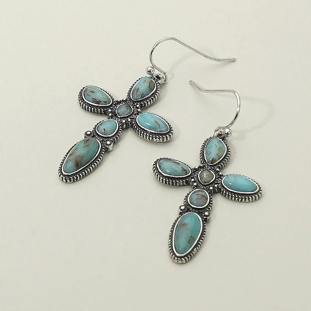 Details • Size : 1" X 1.9" • Fish Hook Back • Elegant drop earrings featuring cross shapes embellished with oval stone inlays and intricate detailing. A stylish accessory blending timeless symbolism with modern fashion, ideal for statement looks or casual wear. • Lead and Nickel Compliant