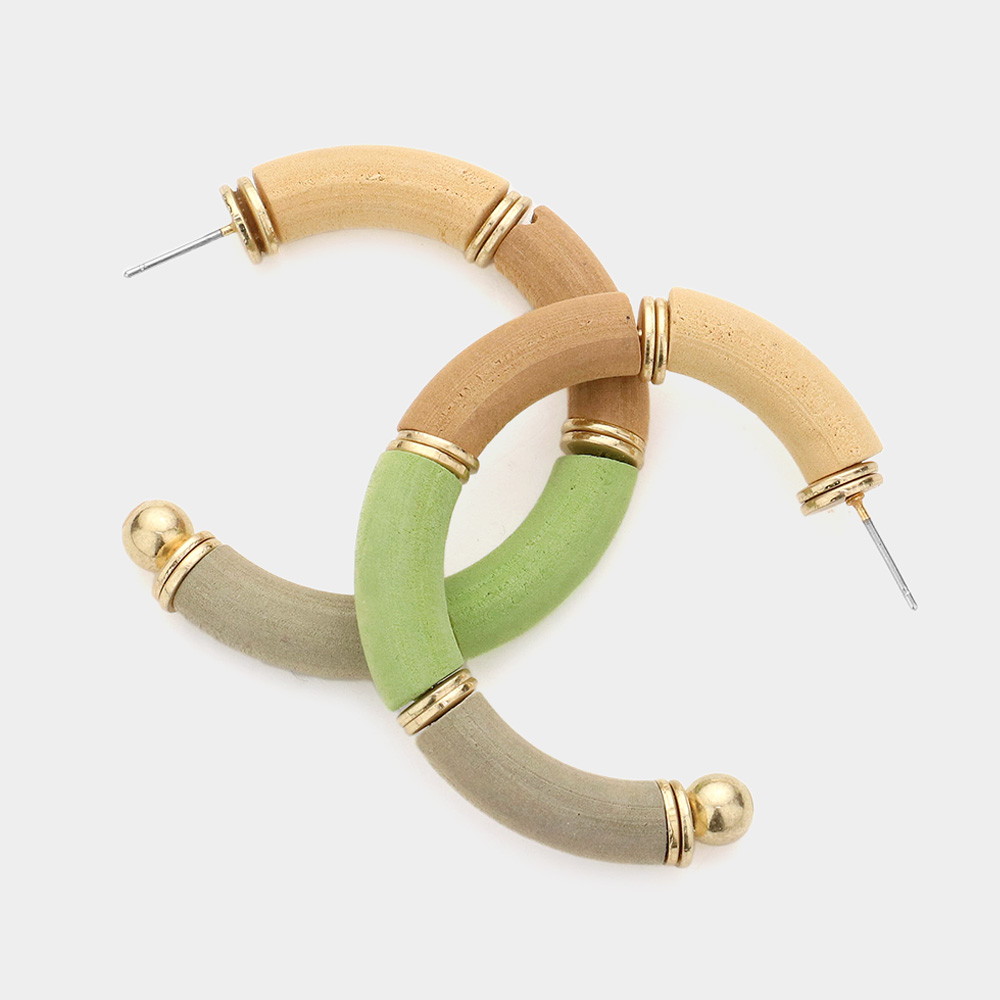 Abstract Textured Metal Wooden Ring Link Dangle Earrings