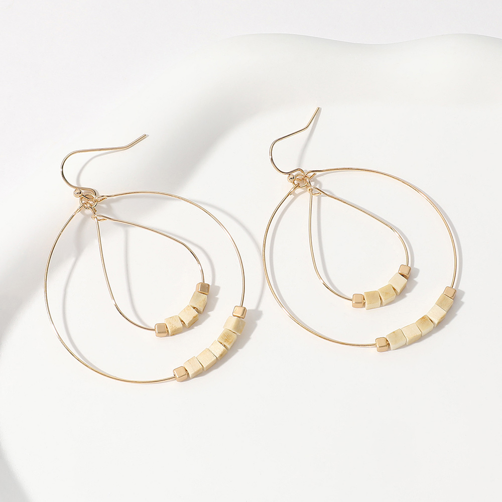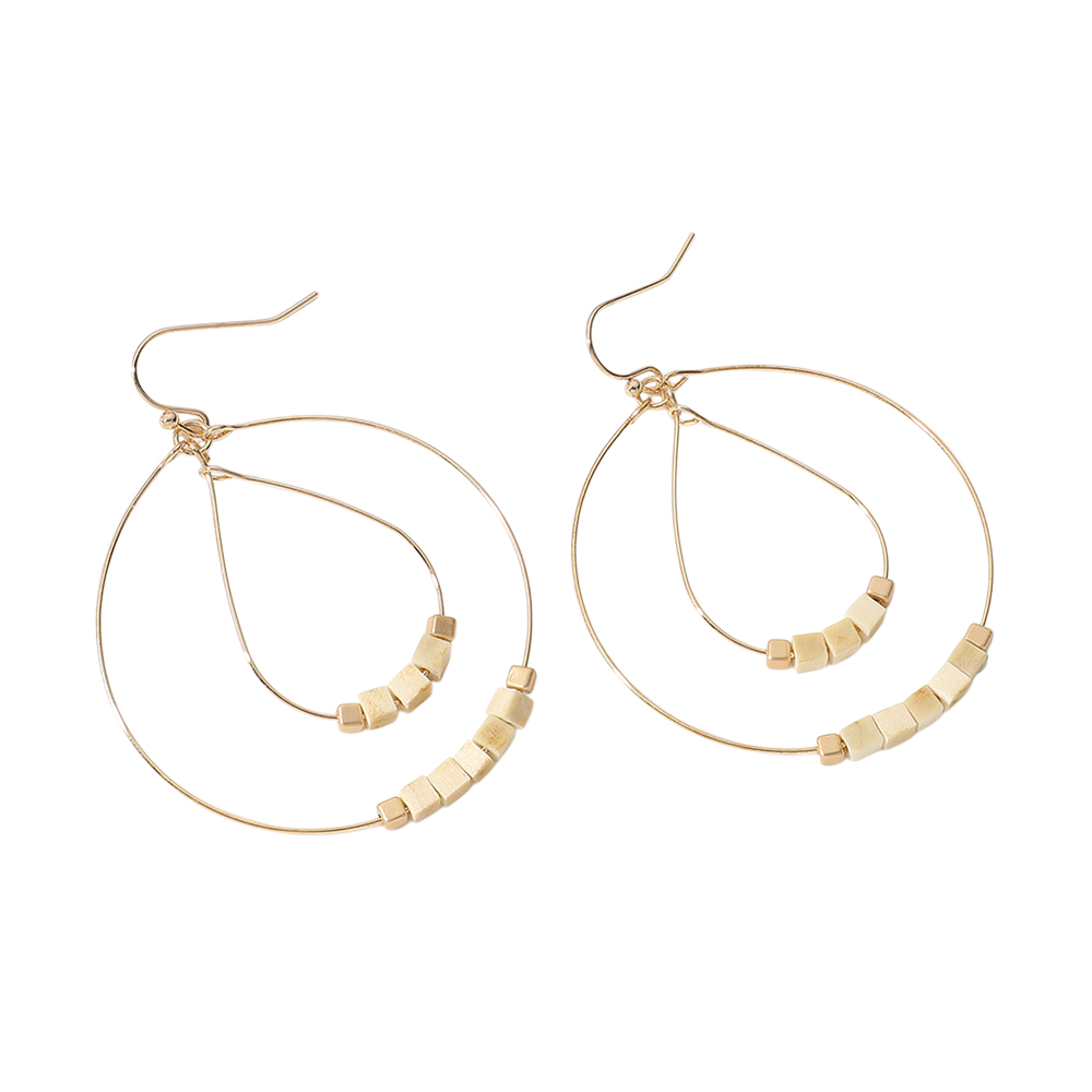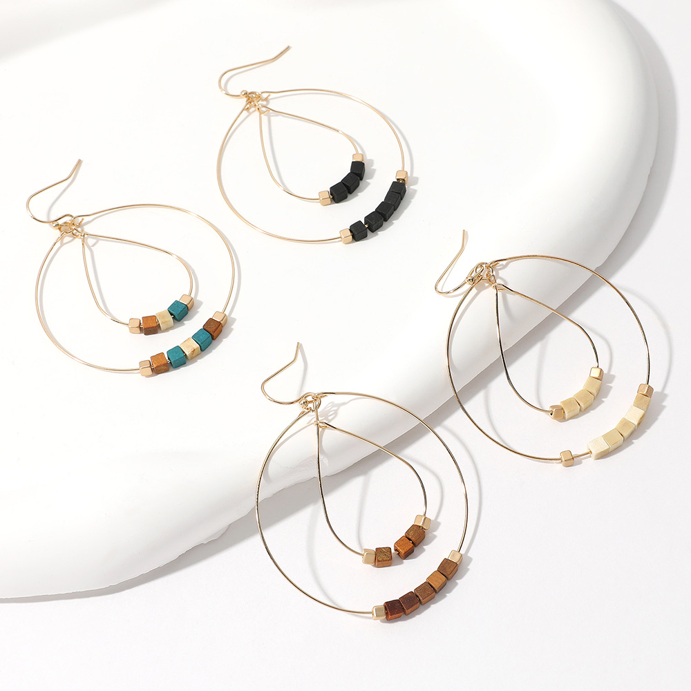 Wooden Cube Beaded Metal Wire Teardrop Round Layered Dangle Earrings