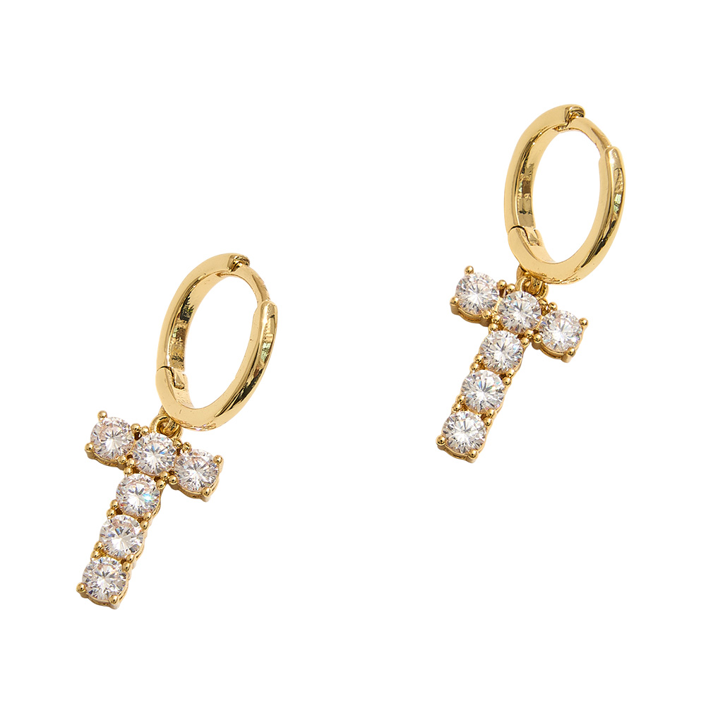 Details • Size : 0.4" X 1.1" • Huggie Back • These elegant hoop earrings showcase dazzling cubic zirconia stones arranged in a cross-shaped dangle, combining timeless symbolism with modern sophistication. Lightweight and versatile, they add a radiant touch to both casual and dressy outfits, making them a meaningful statement piece. • Brass • CZ Cubic Zirconia • Gold Dipped • Hypoallergenic • Lead and Nickel Compliant • Made In Korea