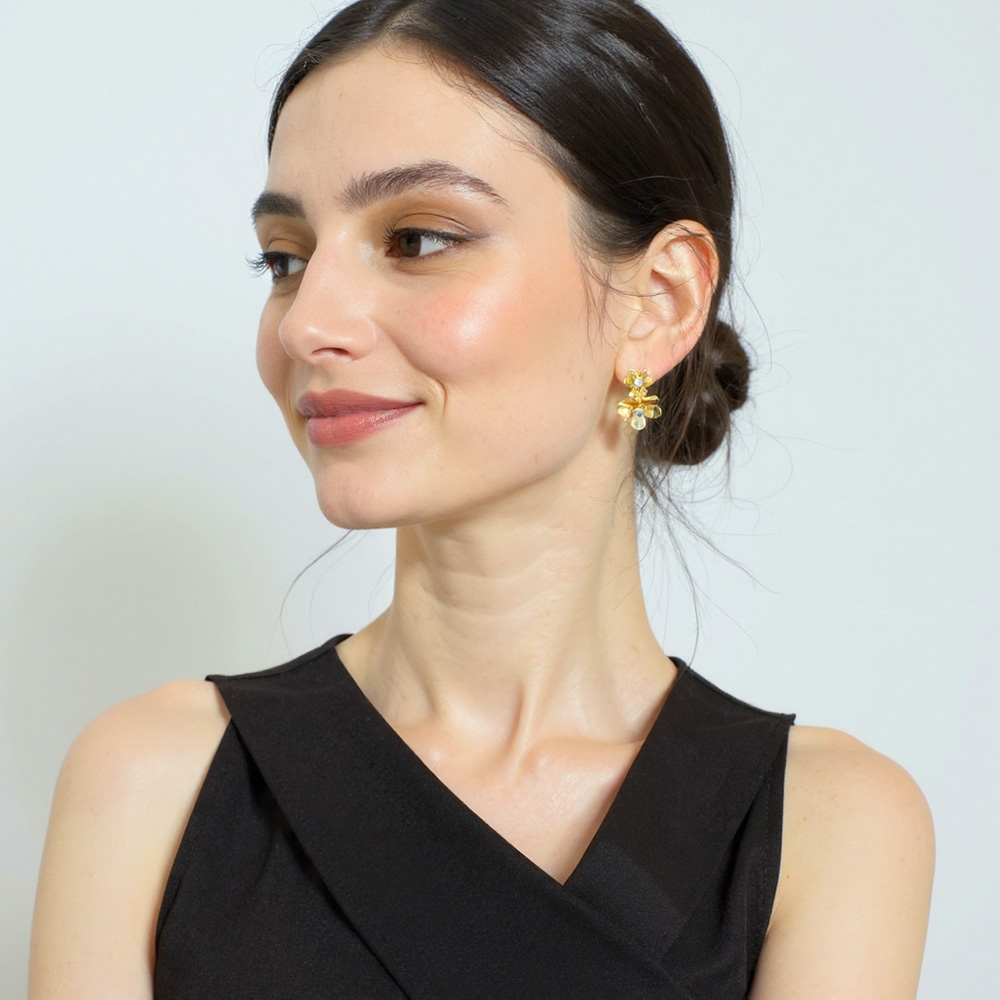 Details • Size : 0.9" X 1" X 0.6" • Post Back • Bring a fresh, playful charm to your style with these huggie hoop earrings, featuring delicate layered floral designs accented by sparkling CZ centers. Perfect for adding a feminine and elegant touch, these hoops pair effortlessly with both casual and dressy looks. • Brass • CZ Cubic Zirconia • Gold Dipped • Hypoallergenic • Lead and Nickel Compliant • Made In Korea