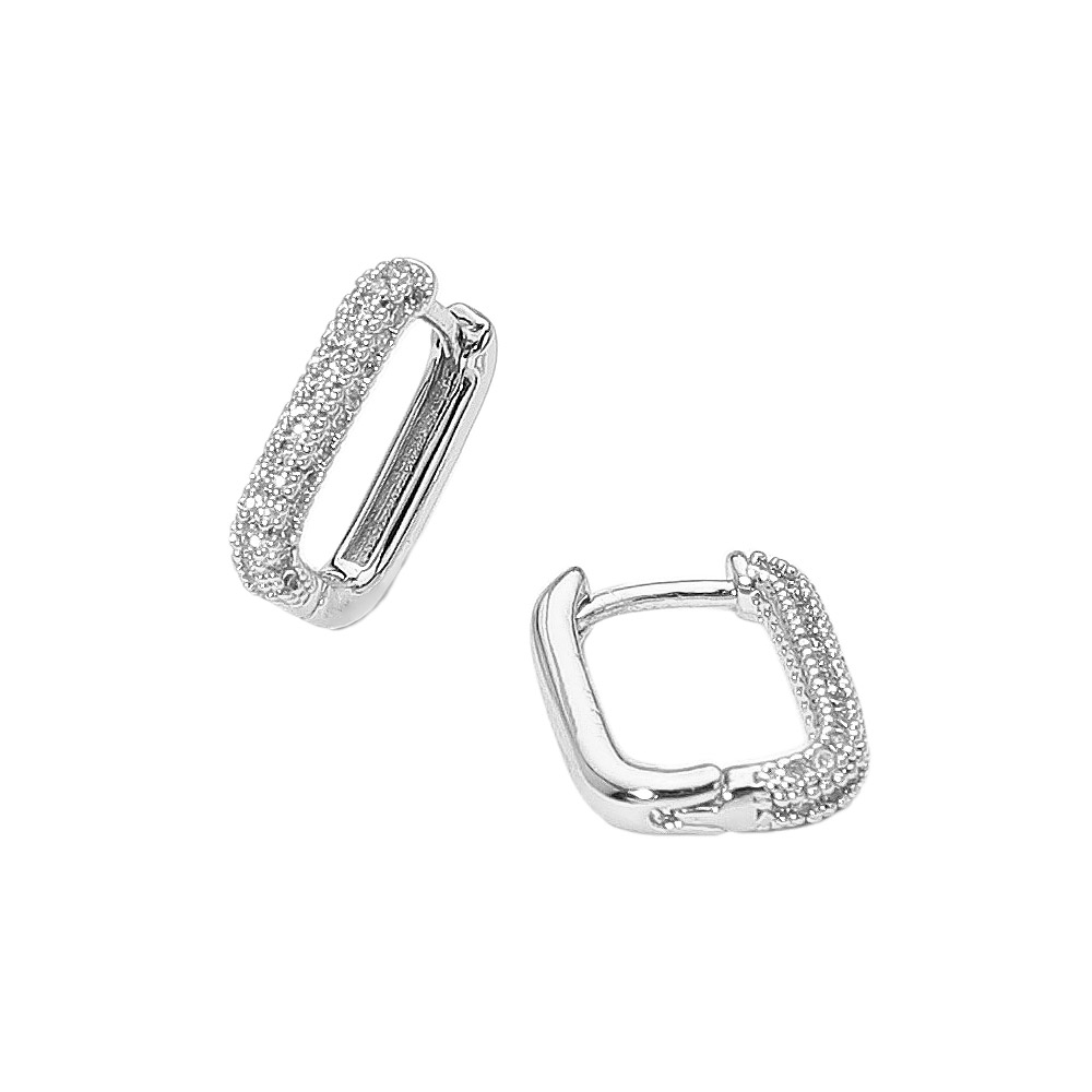 Details • Size : 0.4" X 0.6" • Huggie Back • Modern hoop earrings with a sleek geometric shape, enhanced by shimmering pave accents for a bold yet elegant look. A versatile accessory that adds refined sophistication to everyday wear and polished evening outfits. • Brass • CZ Cubic Zirconia • Gold Dipped • Hypoallergenic • Lead and Nickel Compliant • Made In Korea