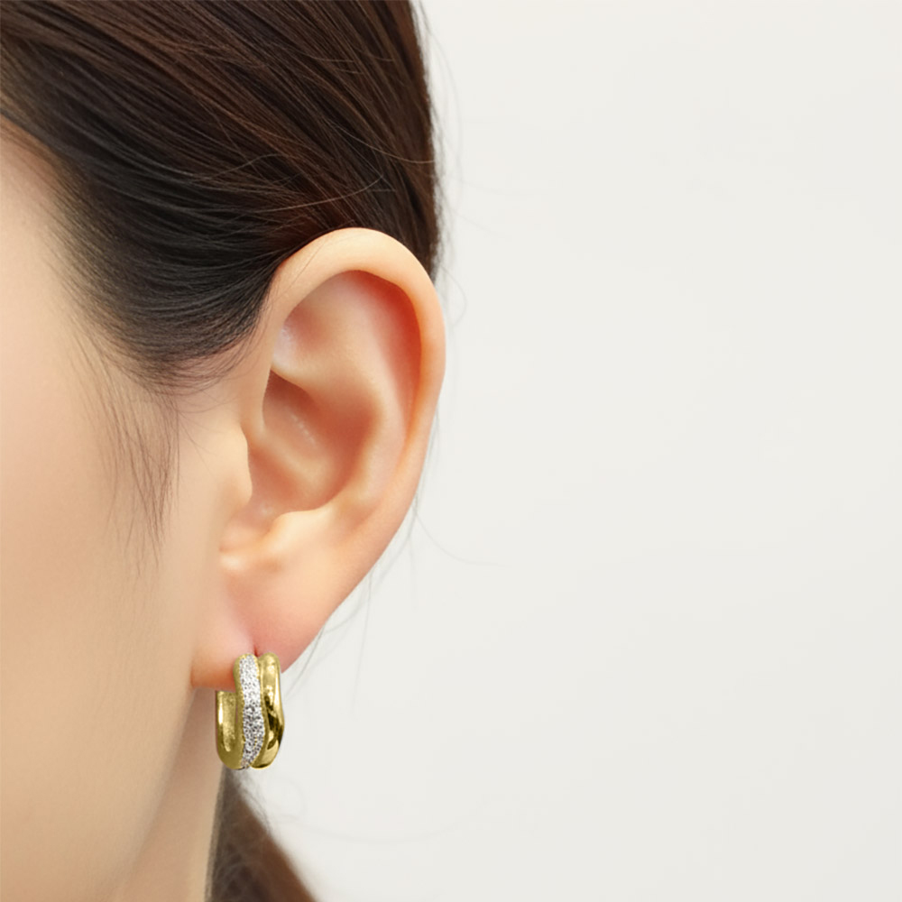 • Chic hoop earrings featuring a layered silhouette accented with shimmering pave details. A stylish blend of bold structure and refined sparkle, these earrings are perfect for elevating casual looks or adding polish to evening outfits.
