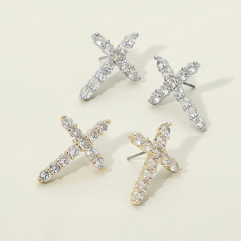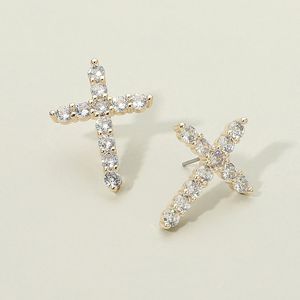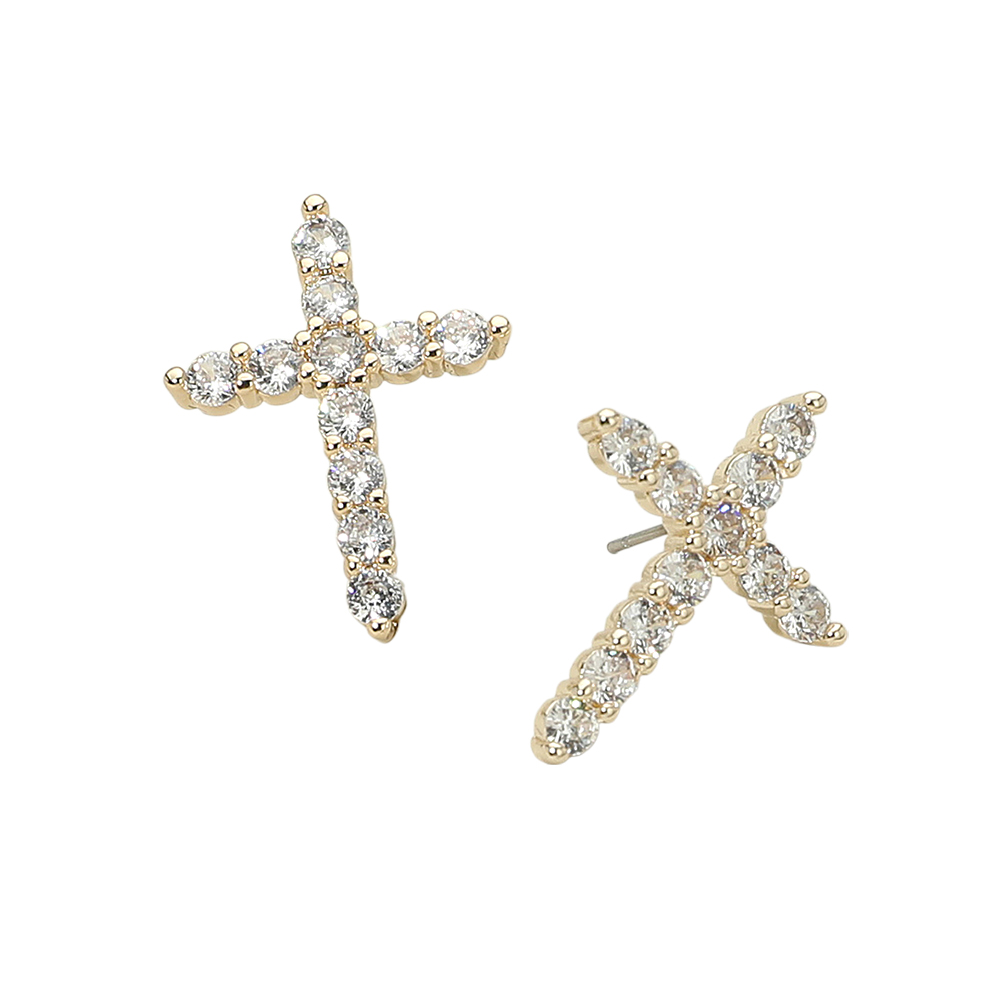 Details • Size : 0.75" X 1" • Post Back • Elegant stud earrings featuring a classic cross design adorned with sparkling cz crystals. These timeless earrings add a touch of brilliance and faith-inspired style, perfect for both daily wear and special occasions. • CZ Cubic Zirconia • Gold Dipped