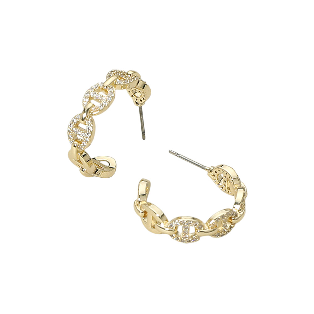 Details • Size : 0.8" X 0.8" X 0.2" • Post Back • Elevate your everyday style with these mariner chain-link hoop earrings adorned with sparkling crystal accents. Their bold yet elegant design adds a touch of modern sophistication, making them perfect for casual wear, work outfits, or special occasions. • CZ Cubic Zirconia • Gold Dipped