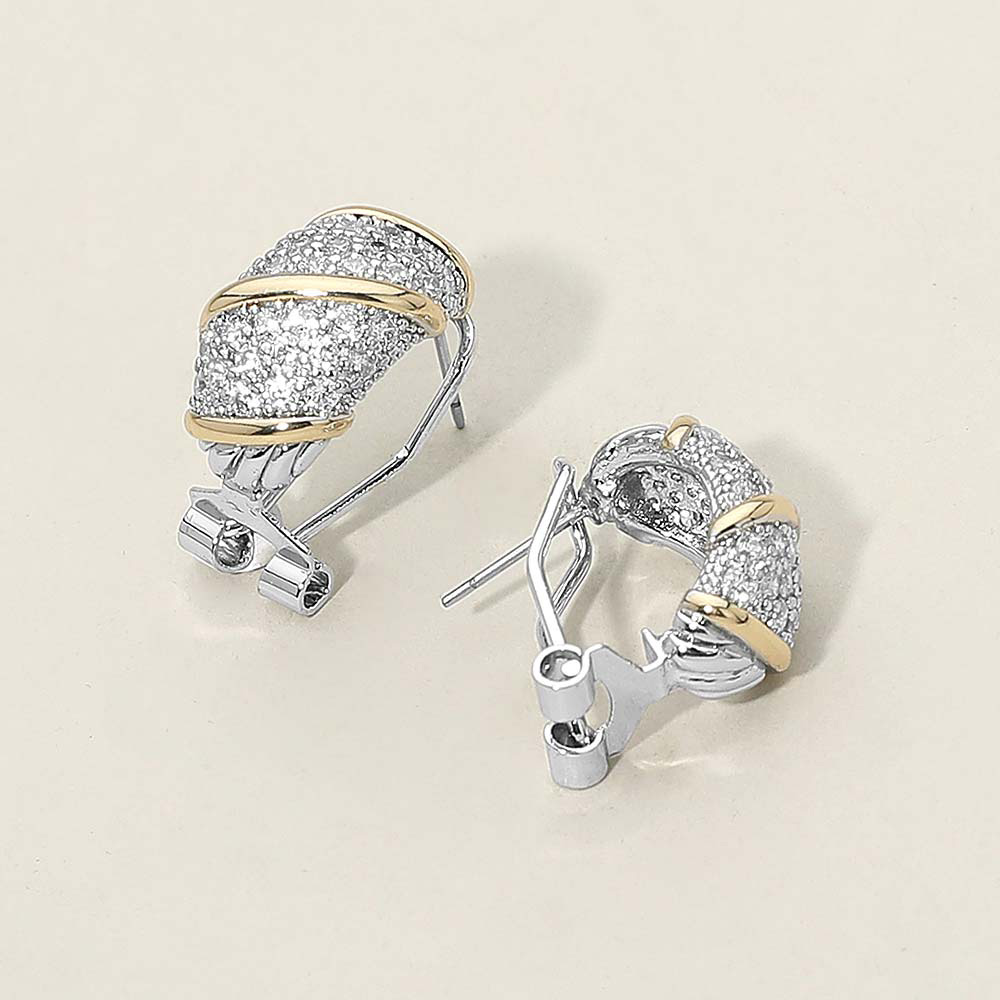 Details • Size : 0.4" X 0.75" • Latch Back • These refined pave hoop earrings feature a sculpted design accented with delicate dual-tone detailing for a sophisticated finish. Their secure closure and sparkling surface make them an ideal accessory for elevating both everyday looks and special-occasion ensembles. • CZ Cubic Zirconia • Gold Dipped