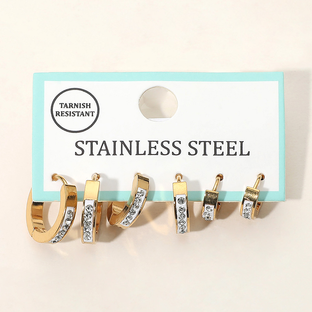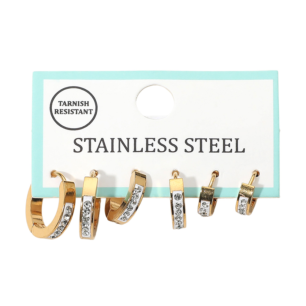 3Pairs - Stainless Steel Stone Pave Bar Huggie Hoop Earring Set